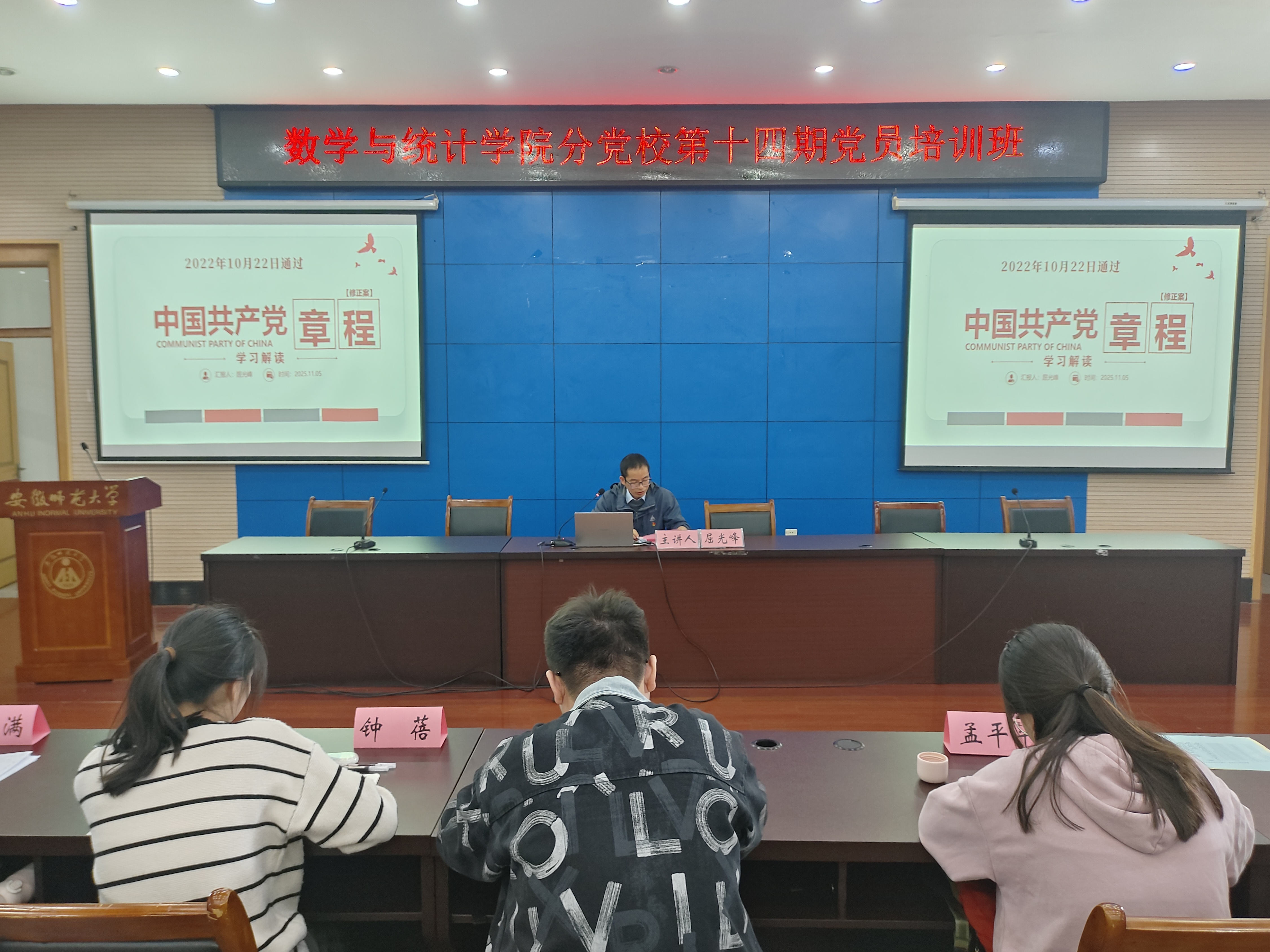 11月5日下午,数学与统计学院第十四期党员培训班在花津校区会议中心第三报告厅进行。数学与统计学院党委组织员屈光峰应邀为培训班学员讲授“学习党章,做合格党员”专题党课。本次党课由分党校副班主任潘楠楠主持。