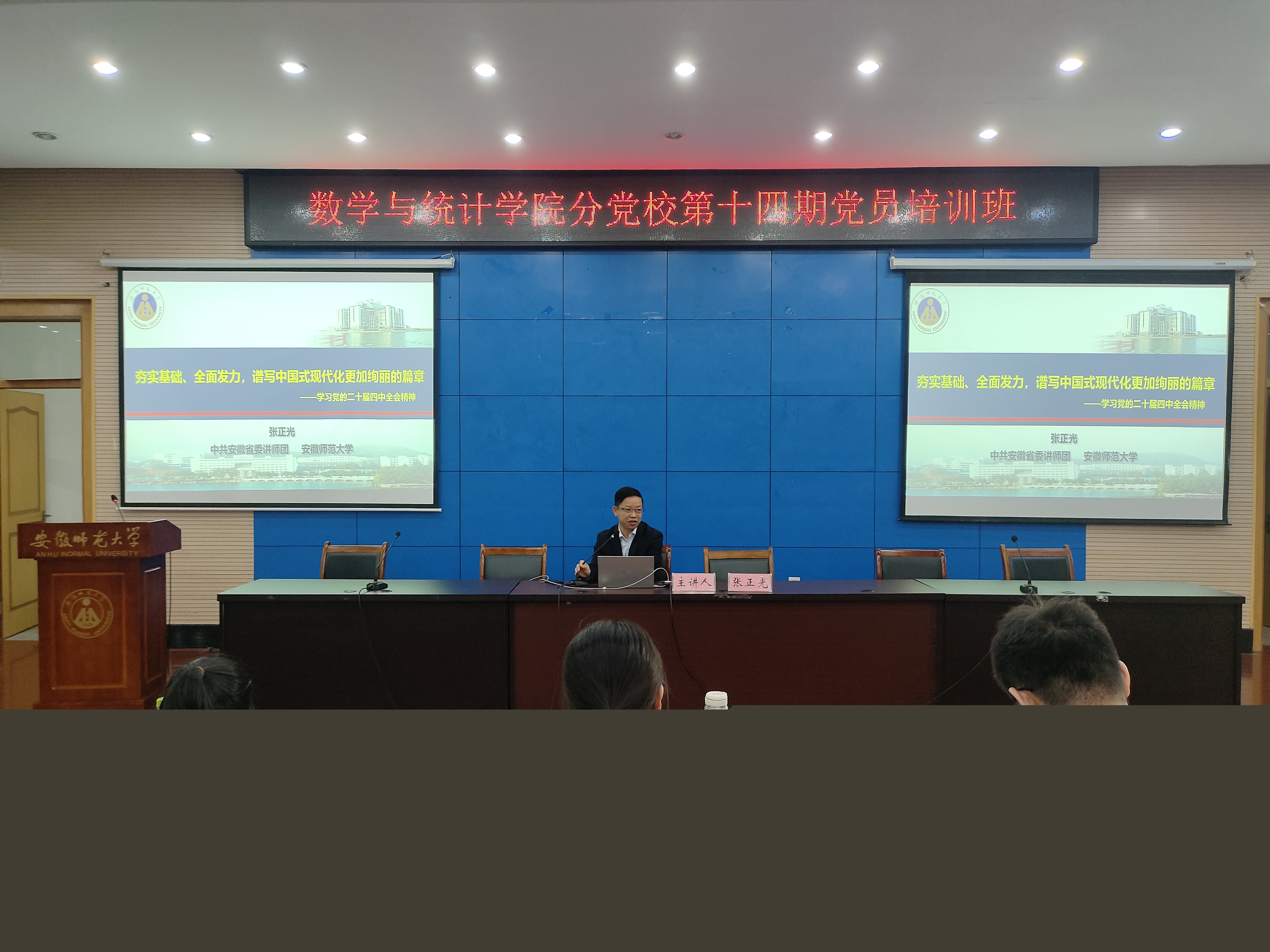 11月5日下午,数学与统计学院分党校第十四期党员培训班在花津校区会议中心第三报告厅开讲。中共安徽省委讲师团理论宣讲专家、安徽师范大学马克思主义学院教授张正光应邀为培训学员讲授“夯实基础、全面发力,谱写中国式现代化更加绚丽的篇章——学习党的二十届四中全会精神”专题党课。本次党课由分党校副班主任潘楠楠主持。