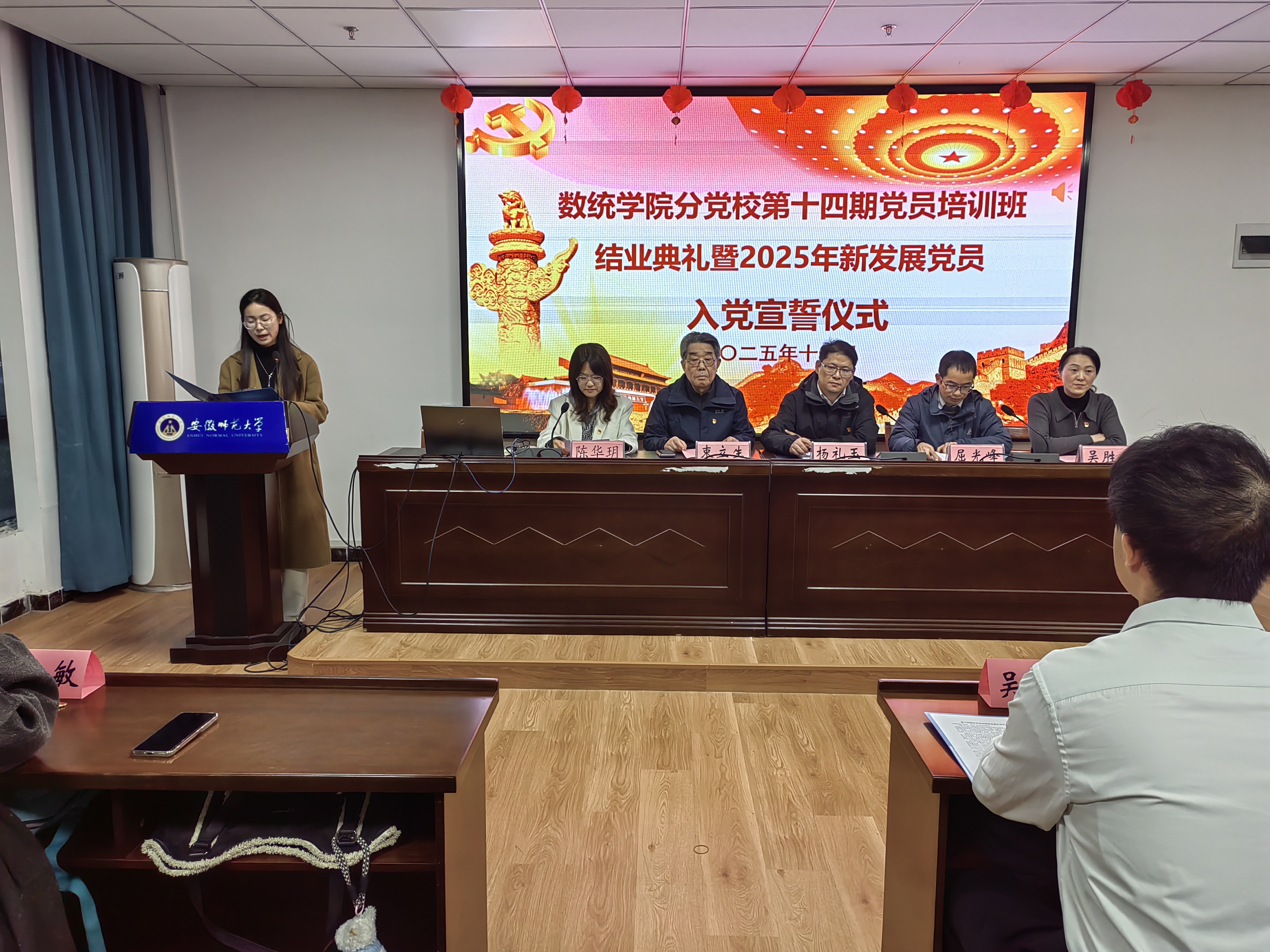11月12日下午,数学与统计学院分党校第十四期党员培训班暨2025年新发展党员入党宣誓仪式在花津校区文典楼C108报告厅顺利举行。数学与统计学院党委副书记、分党校副校长杨礼玉,党委组织员屈光峰,关工委常务副主任束立生,党委秘书吴胜儿以及培训班全体学员共同参加了本次结业典礼。结业典礼由分党校班主任陈华玥主持。