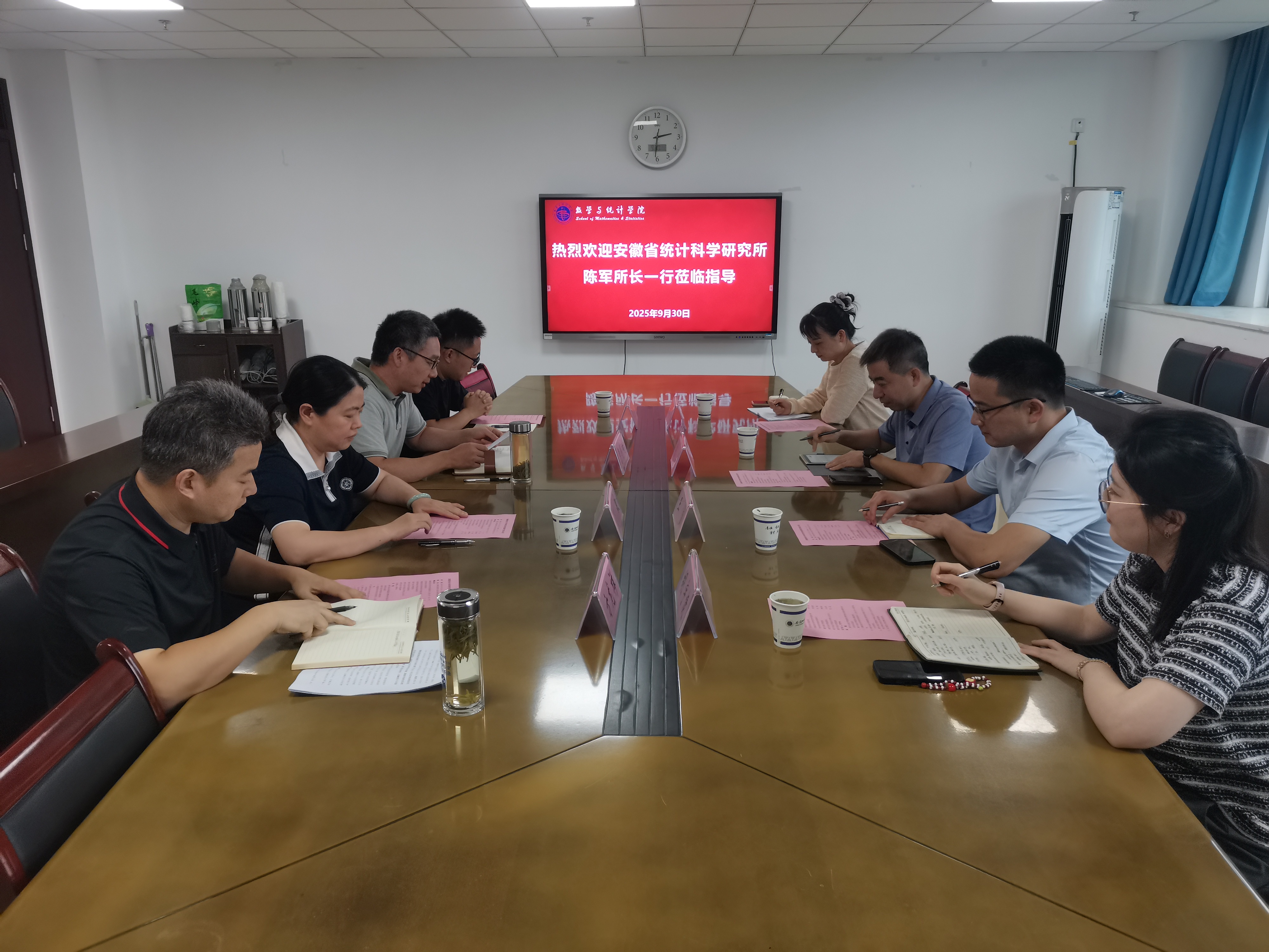 为促进统计学产学研深度融合,9月30日下午,数学与统计学院与安徽省统计科学研究所举行专题座谈。安徽省统计科学研究所副所长(主持工作)陈军、芜湖市统计局副局长王寅、安徽省统计科学研究所中级统计师钟晶、芜湖市统计局综合科副科长胡宇捷一行到访调研交流。院长汤敏、统计学硕士一级学科负责人方龙祥、统计系教师贺磊参加座谈。会议由副院长曹明响主持。