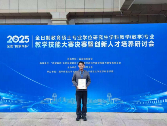 2025年10月24日-10月27日,全国“田家炳杯”全日制教育硕士专业学位研究生学科教学(数学)专业教学技能大赛在西华师范大学圆满落下帷幕。数统学院2024级学科教学(数学)专业研究生取得佳绩,其中胡万平荣获一等奖(指导教师:尚宇飞、董建功),黄梓怡同荣获二等奖(指导教师:邓凡茂、王敏),李书然同学荣获三等奖(指导教师:董建功、孙翠芳)。
