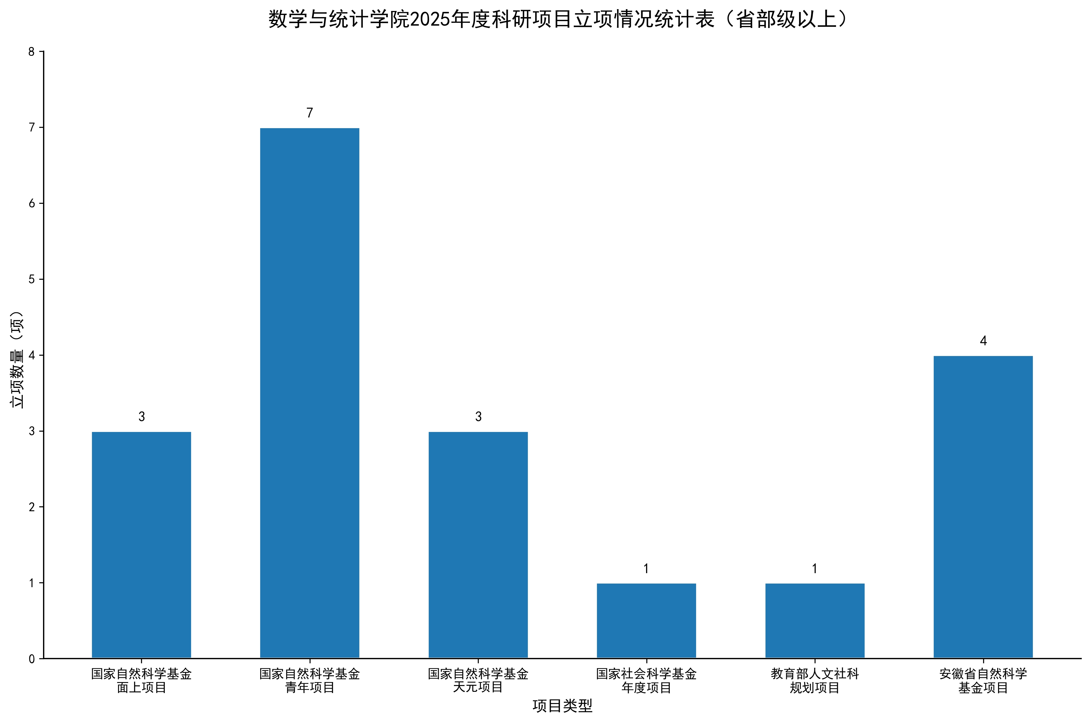 2025年度,数统学院继续锚定“科研强院”战略,全院科研氛围浓厚,课题申报热情高涨。科研项目申报继续保持良好势头,各类项目实现重要突破,共获批国家自然科学基金项目13项,国家社会科学基金项目1项。此外,还获批教育部人文社科规划项目1项,安徽省自然科学基金青年A、B类项目各1项、面上项目1项、C类项目1项。立项总金额达492万元。项目在数量和质量上均呈现跃升态势,为学院进一步增强科研竞争力、服务学校事业发展奠定了坚实基础。