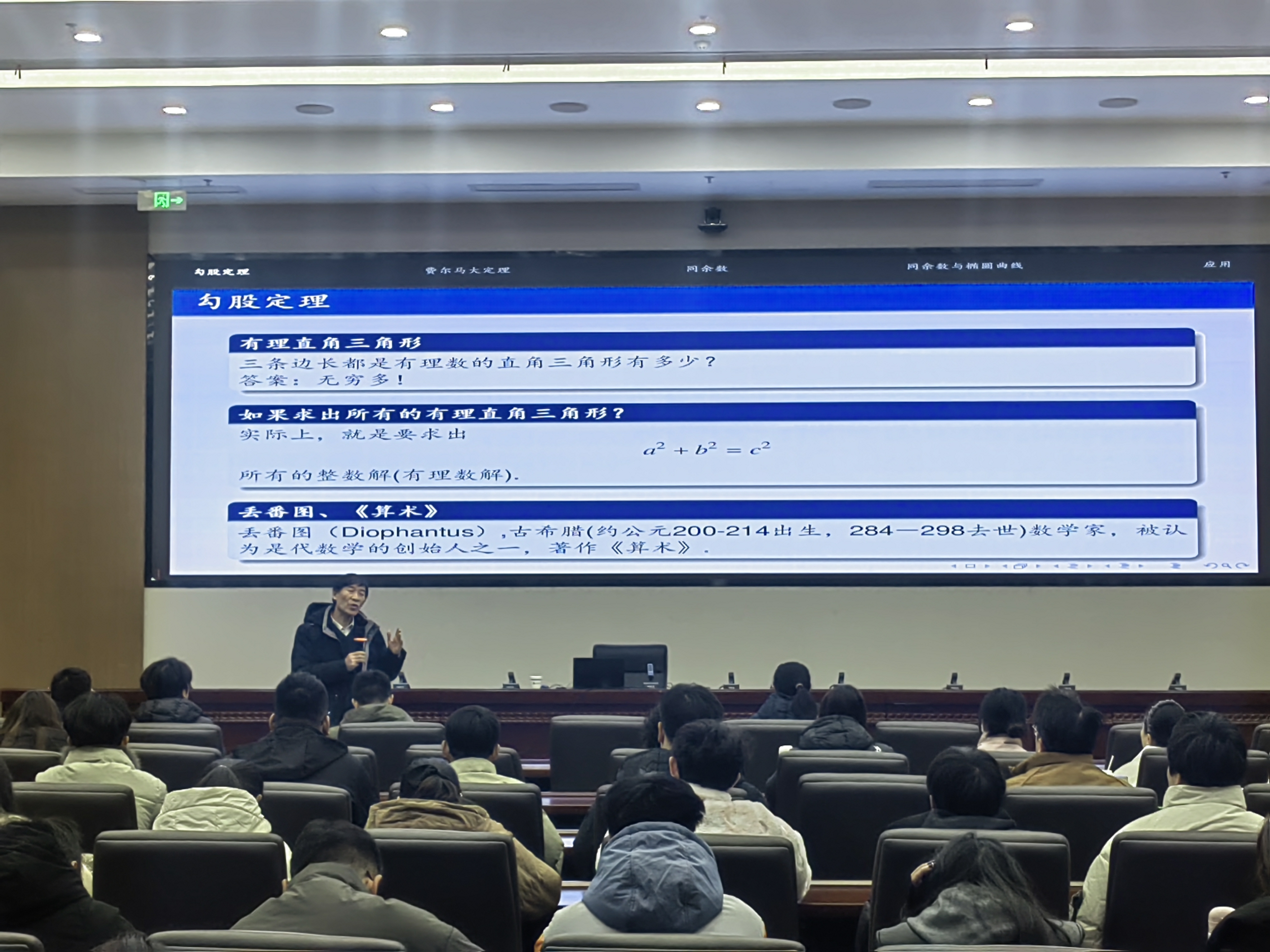 秦厚荣教授从经典的勾股定理出发,他系统回顾商高、毕达哥拉斯定理、费马大定理等重要数论知识发展脉络,深入浅出地引出现代数论的核心课题之一——同余数问题。秦厚荣教授阐释了同余数的定义,揭示了该问题与椭圆曲线等现代数学工具的深刻联系。他还介绍了费马、欧拉、斐波那契等数学人物在该问题上的贡献,以及当代数学家在相关领域的关键突破。报告还涉及BSD猜想、Tunnell定理等重要结论,展现了同余数研究在数论前沿中的活跃地位。