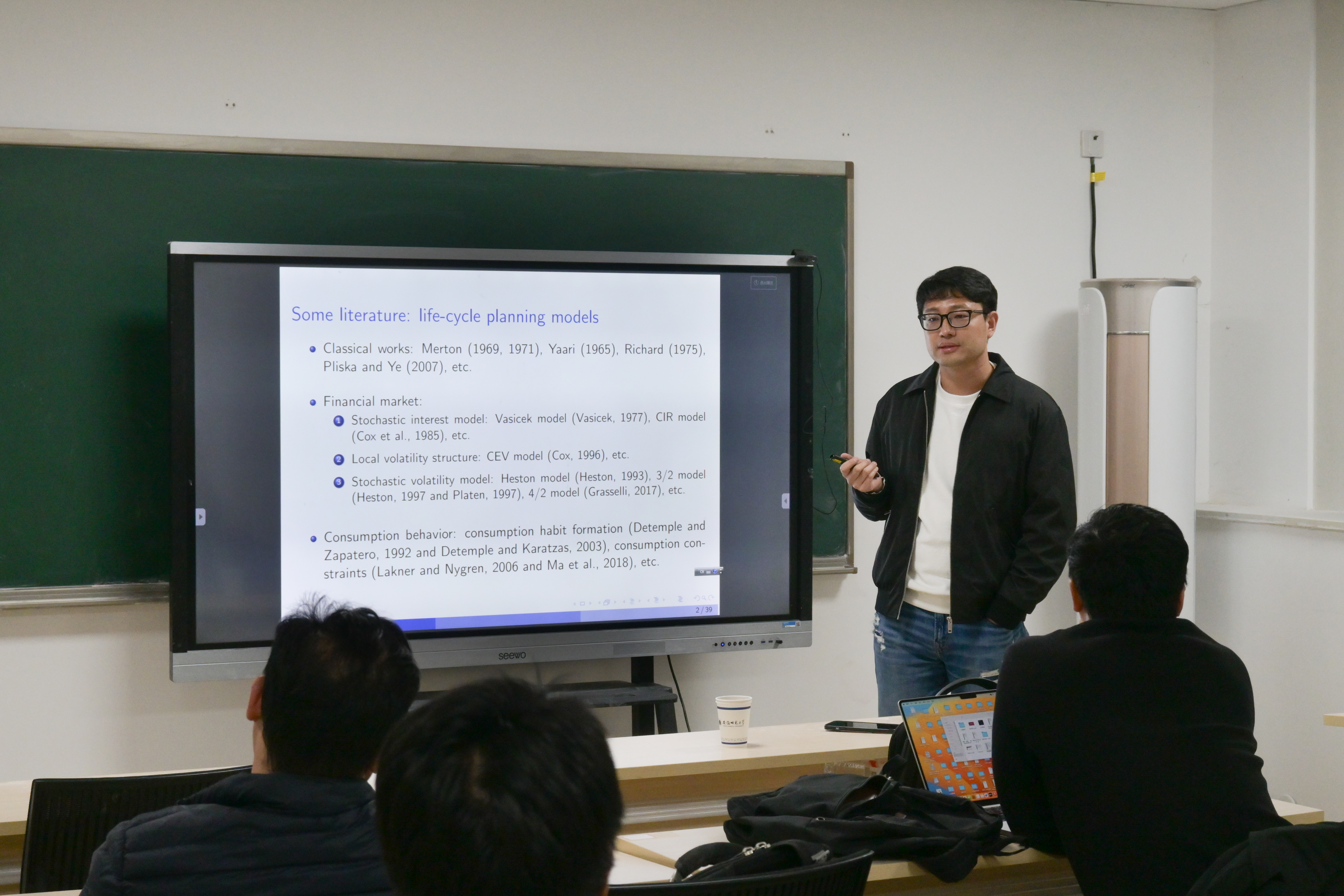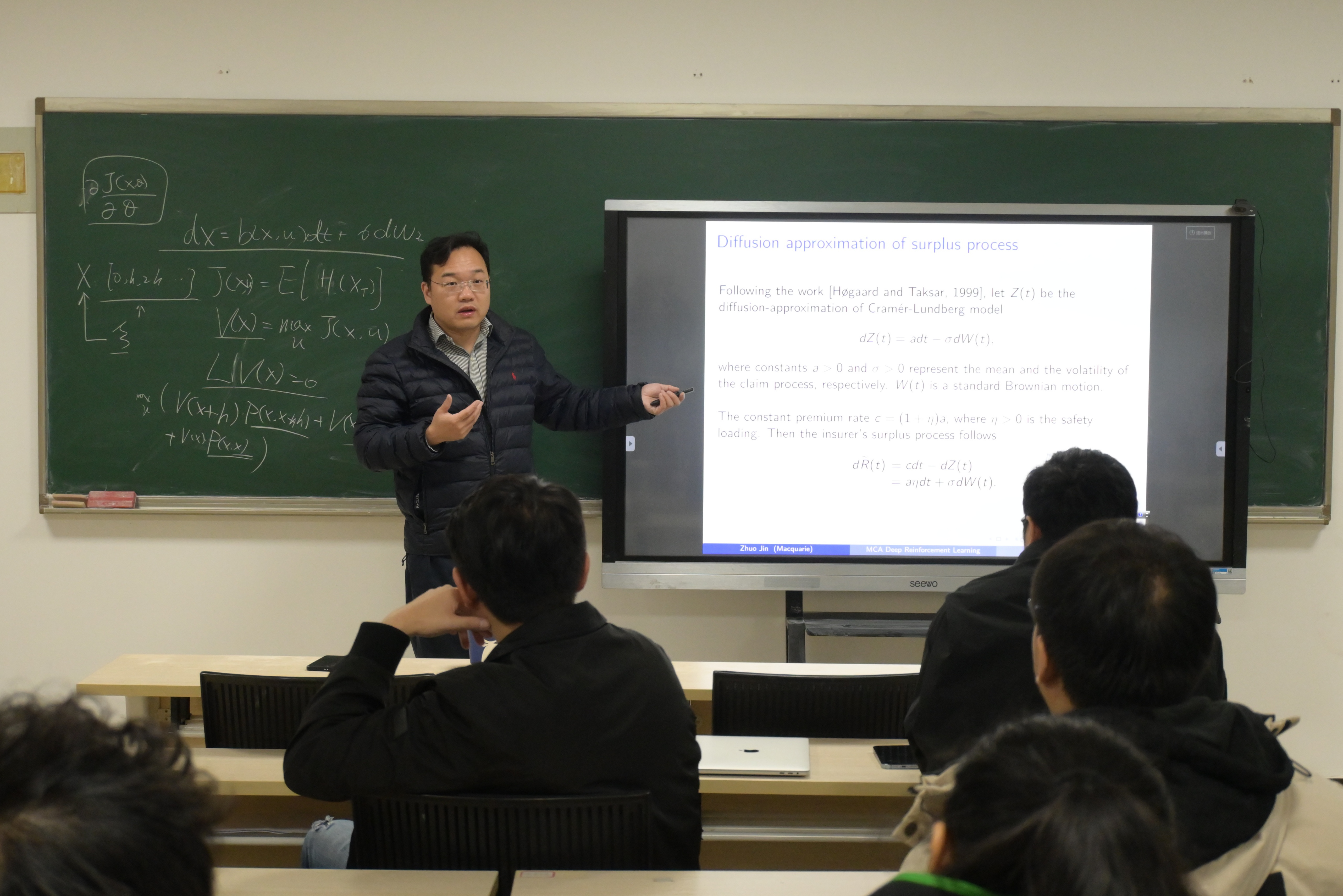 2025年12月28日,安徽师范大学数学与统计学院随机分析与智能控制团队主办的短期课程《保险精算研究中的随机控制与人工智能方法》在文典楼C204教室顺利举行。本次课程聚焦保险精算领域的前沿交叉方向,融合随机控制理论与人工智能方法,吸引了校内众多教师、研究生及高年级本科生积极参与。
