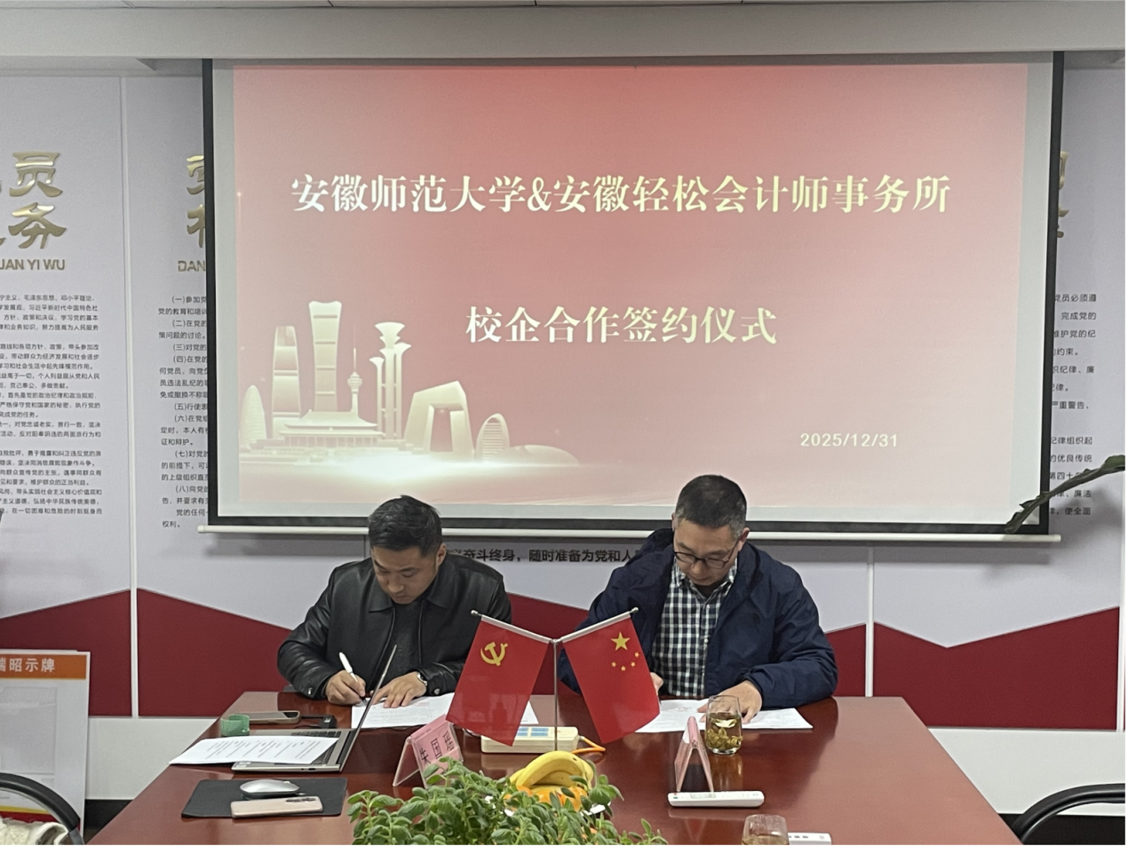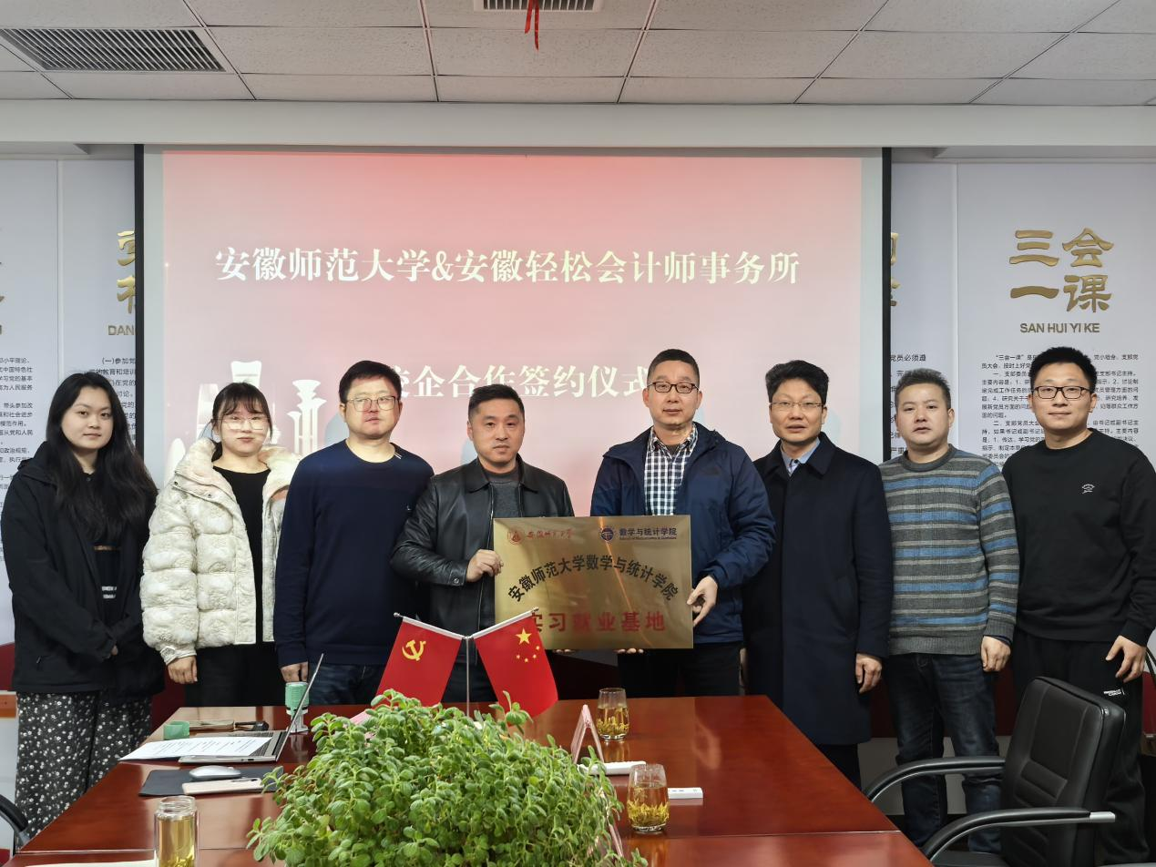 2025年12月31日,数学与统计学院与安徽轻松会计师事务所共建实习就业基地签约授牌仪式在安徽轻松会计师事务所举行。数学与统计学院副院长曹明响、统计学一级硕士点负责人方龙祥、高等数学教学部主任郭明乐、统计系副主任贺磊一行赴事务所参加活动。安徽轻松会计师事务所总经理吴成椿、党支部书记贾伟、工会主席朱国瑶、办公室主任夏心儿出席了仪式。仪式由安徽轻松会计师事务所夏心儿主持。