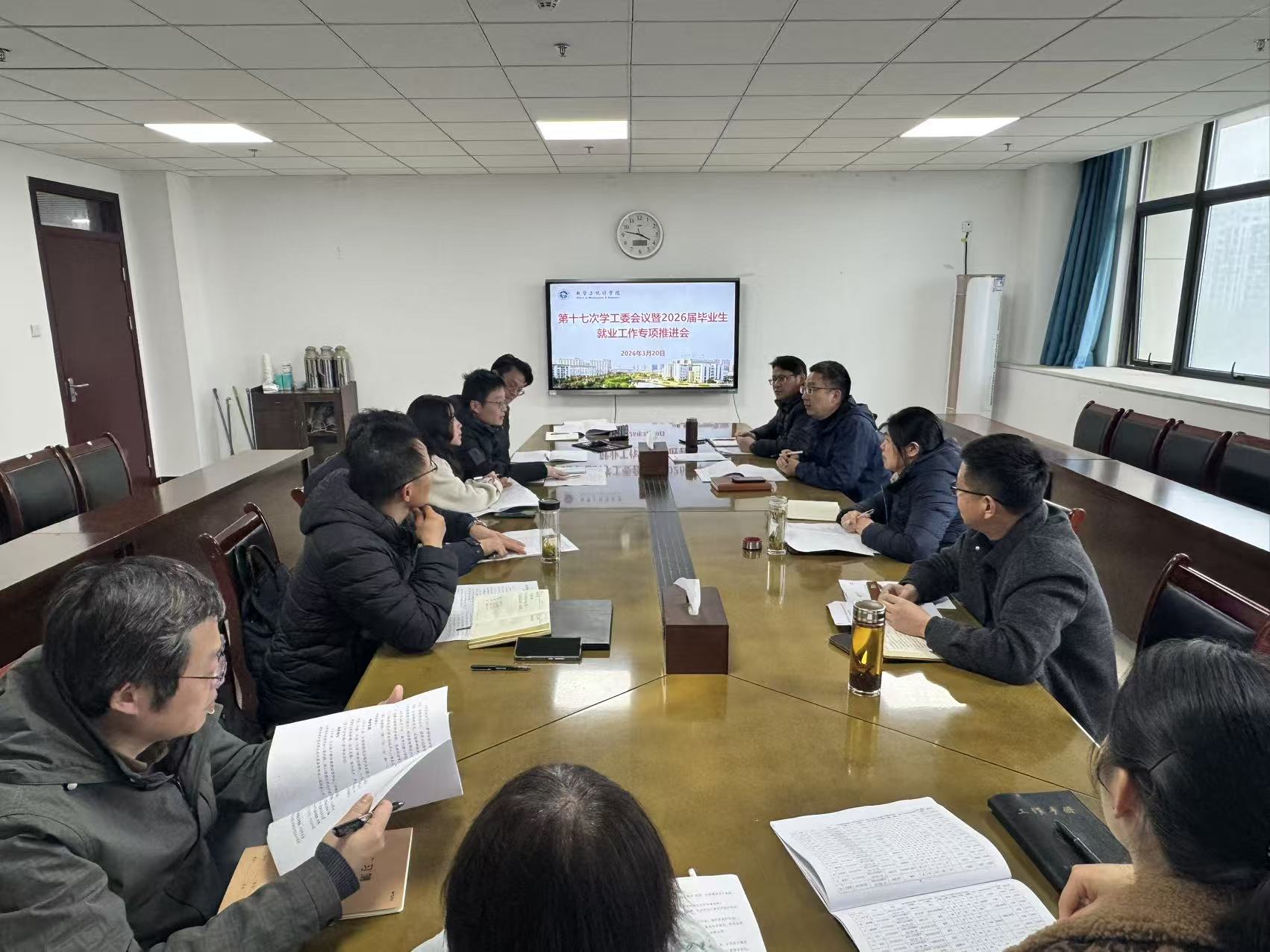 为全力促进2026届毕业生高质量充分就业,3月20日下午15时,数学与统计学院在文典楼C410会议室召开第十七次学工委会议暨2026届毕业生就业工作专项推进会。学院院长汤敏,党委副书记杨礼玉,副院长曹明响、崔建,全体教工委员及全体专兼职辅导员参加会议,会议由杨礼玉主持。