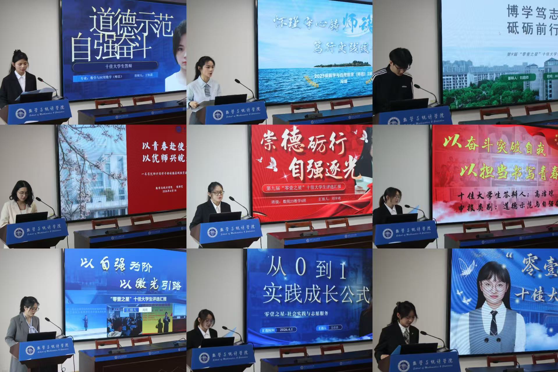 会上,候选同学依次登台汇报,以饱满热情、鲜活事例与真挚表达,全面展现数统学子德才兼备、全面发展的昂扬风貌。他们中,有人深耕数学理论与统计应用,专业成绩名列前茅,在学术训练中夯实基础、锤炼本领;有人勇攀竞赛高峰,在全国大学生数学竞赛、数学建模竞赛等高水平赛事中屡获佳绩,以创新思维与团队协作破解难题;有人扎根学生工作,主动服务师生,在学风建设、活动组织、日常管理中担当尽责;有人热心公益实践,积极参与支教助学、社区服务与校园志愿活动,用行动诠释青年担当;还有人坚持全面发展,在文体、创新创业与社会实践中不断突破自我,提升综合素养。他们以脚踏实地的奋斗轨迹,生动诠释学院 “严谨、质朴、务实、求真” 的院风内涵,充分展现出新时代数统青年志存高远、勤学笃行、追求卓越、担当有为的青春风采。