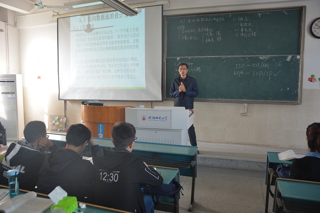 本网讯(文/陈付龙 高可飞 图/王云鹏)2017年11月3日上午第一节课,安徽师范大学校级本科教学观摩示范课本学期的第16讲由数计学院郑孝遥副教授在花津校区教学楼2010506多媒体教室进行。郑孝遥副教授凭借雄厚的软件工程知识背景和丰富的软件开发经验,为现场师生讲授了《软件工程导论》课程中“面向数据流的设计方法”这一内容。校院两级督导组成员、数计学院领导、系部主任及学院部分中青年教师等十五人观摩了本次示范课。