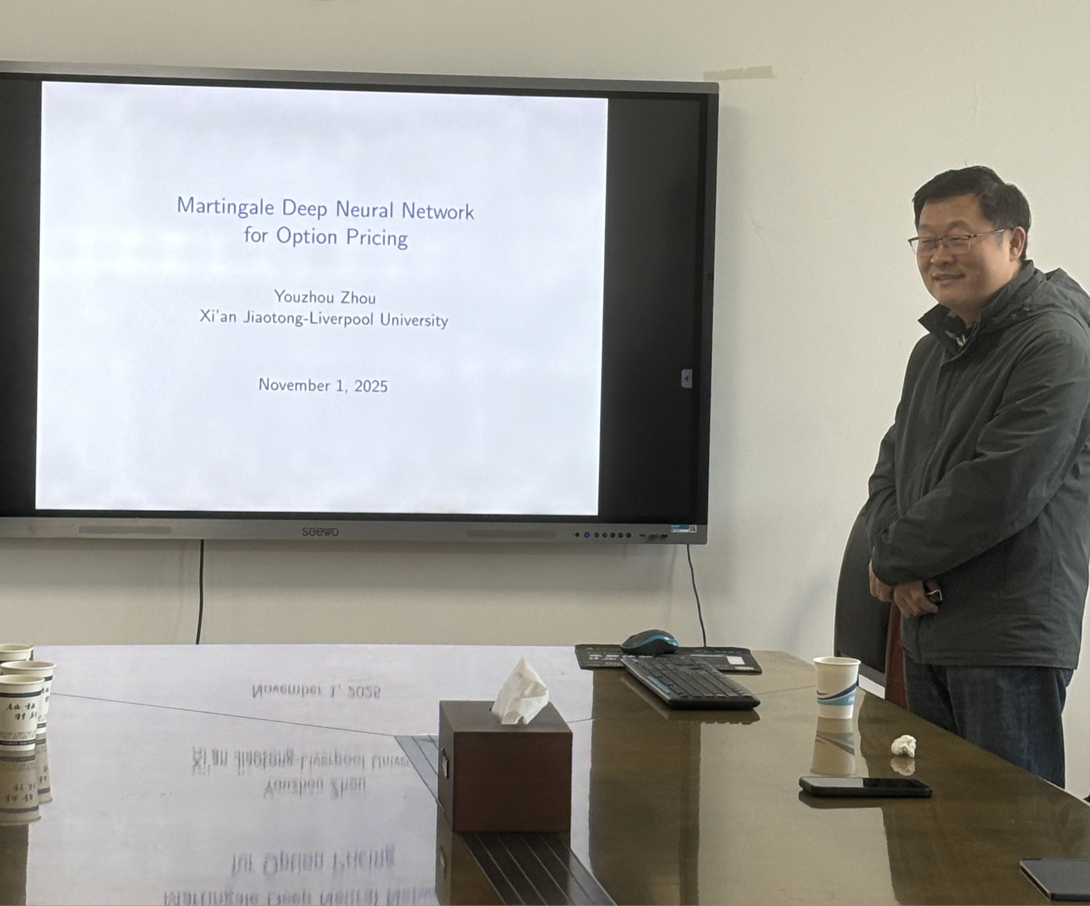 2025年11月2日,西交利物浦大学周友洲副教授应邀在数学与统计学院随机分析与数理金融研究中心系列讲座第107讲作题目“Martingale neural network for option pricing”的学术报告。学院申广君教授、范锡良教授、尹修伟副教授、张树雄老师、高云石老师参加,报告会由申广君教授主持。
