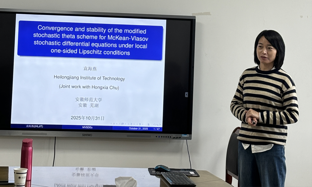 2025年10月31日,黑龙江工程学院袁海燕教授应邀在数学与统计学院随机分析与数理金融研究中心系列讲座第108讲作题目“Convergence and stability of the modified stochastic theta method for McKean-Vlasov stochastic differential equations under local Lipschitz conditions”的学术报告。学院申广君教授、范锡良教授、崔静教授、尹修伟副教授、张树雄老师、高云石老师参加,报告会由申广君教授主持。