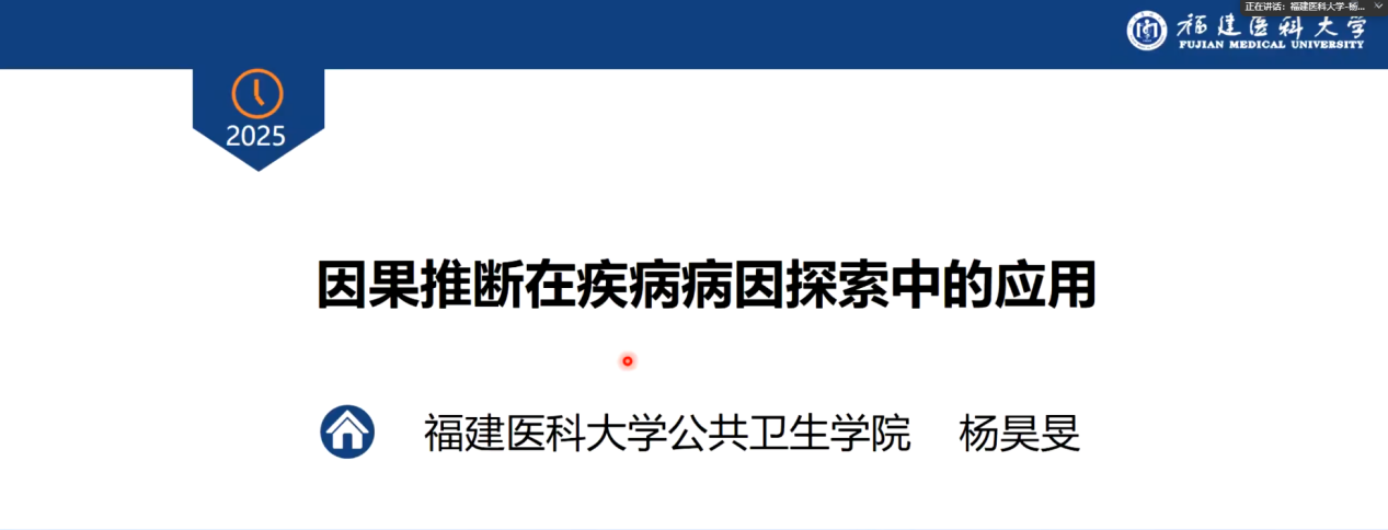 2025年11月12日,福建医科大学杨昊旻教授应邀在数学与统计学院零壹论坛第445讲作题为“因果推断在疾病病因探索中的应用”的线上学术报告。学院方龙祥教授、许凯教授、贺磊副教授以及福建医科大学和学院部分研究生参加,报告会由学院副院长曹明响教授主持。