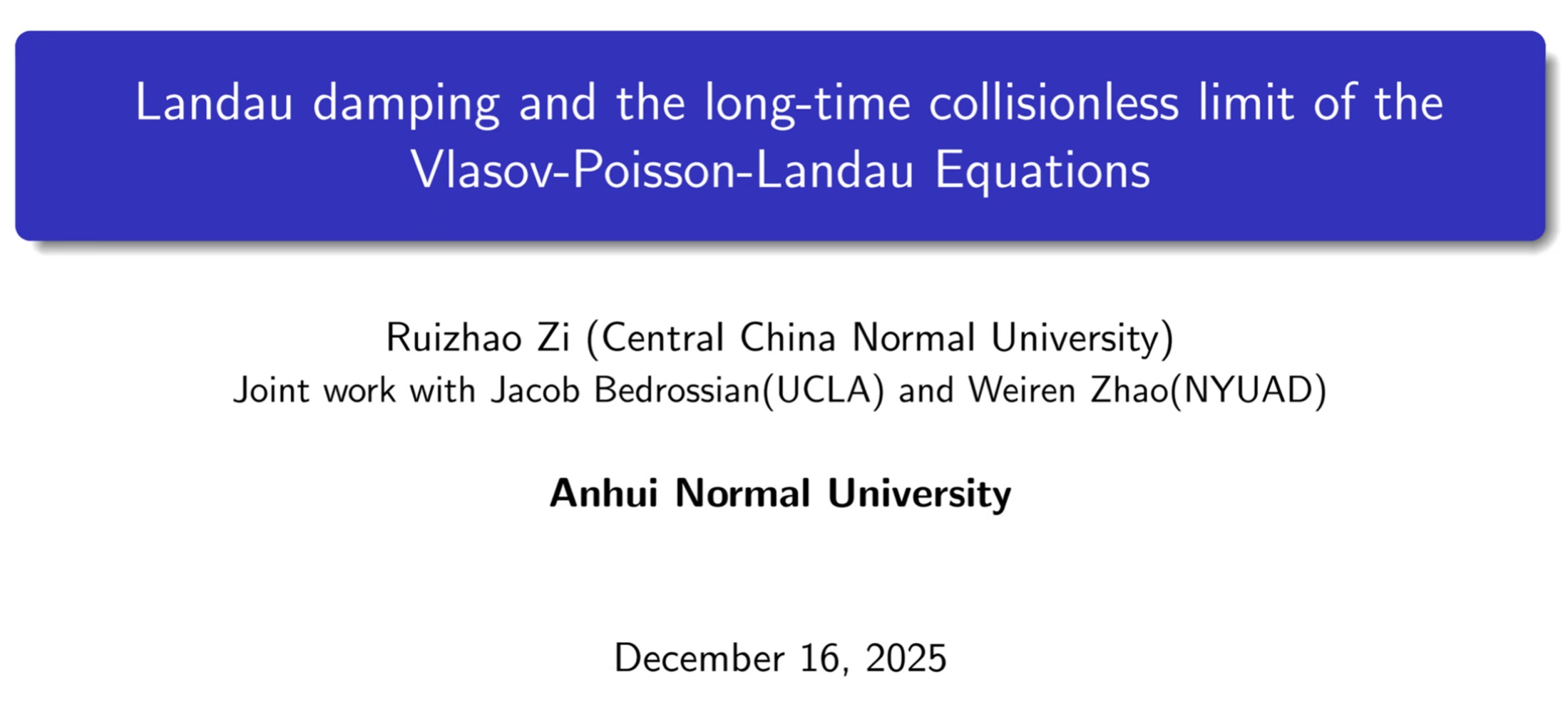 2025年12月16日上午,华中师范大学訾瑞昭教授应邀在数学与统计学院青年方程论坛第90期作题为“Landau damping and the long-time collisionless limit of the Vlasov-Poisson-Landau Equations”的学术报告。报告会由学院副院长费明稳教授主持,学院偏微分方程团队老师以及应用数学专业的部分研究生参加了报告会。