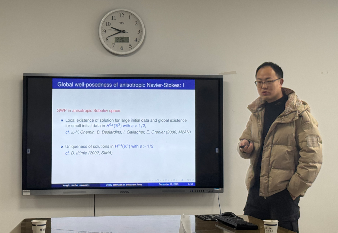2025年12月20日,安徽大学李扬副教授应邀在数学与统计学院青年方程论坛第92期作题为“Decay estimates for anisotropic Navier-Stokes equations and Boussinesq equations”的学术报告。报告会由学院于洋海副教授主持,学院偏微分方程团队老师以及应用数学专业的部分研究生参加了报告会。