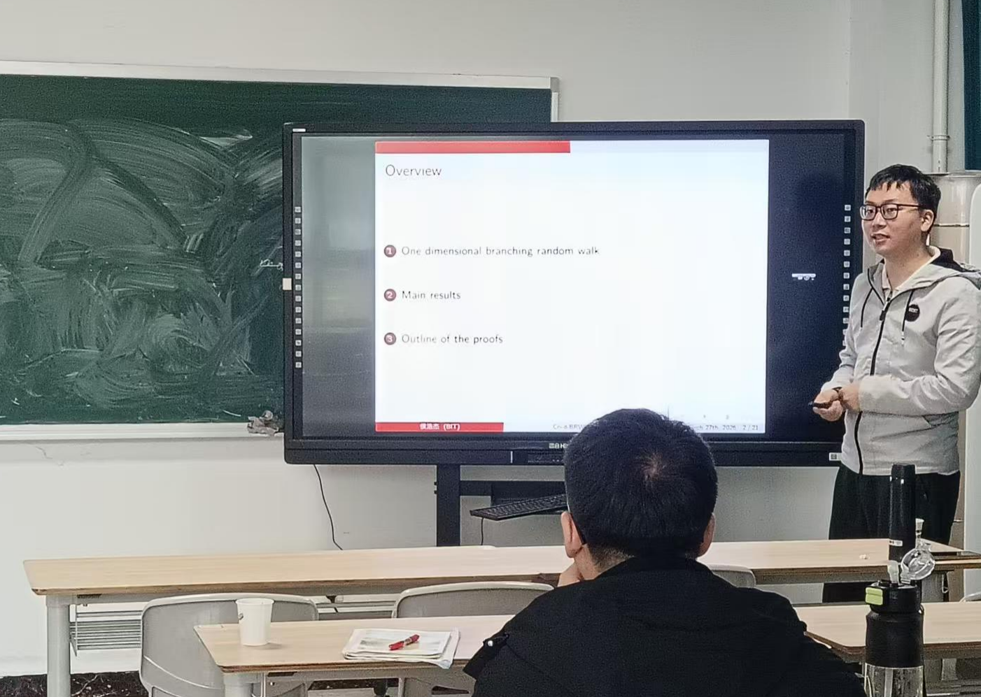 报告会上,侯浩杰首先介绍了分枝随机游动的定义,然后详细介绍了近期关于临界分支随机游动长时间行为的结果,同时报告了自己与合作者关于高维分支随机游动最值的研究。