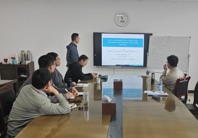 2026年4月21日上午,香港中文大学谈进研究助理教授在数学与统计学院分析与计算系列讲座第99讲应邀作题为“On the Lions density patch problem for the inhomogeneous incompressible Navier-Stokes equations”的学术报告。报告会由学院刘吕桥副教授主持,学院于洋海副教授、汤厚志博士、韩敬文博士以及应用数学专业的部分研究生参加了报告会。
