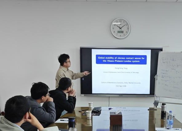 2026年4月21日上午,华南理工大学杨东成副教授在数学与统计学院分析与计算系列讲座第100讲应邀作题为“Global stability of viscous contact waves for the Vlasov-Poisson-Landau system”的学术报告。报告会由学院刘吕桥副教授主持,学院于洋海副教授、汤厚志博士、韩敬文博士以及应用数学专业的部分研究生参加了报告会。
