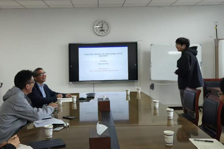 2026年4月23日,武汉大学周一夫教授应邀在数学与统计学院分析与计算系列讲座第102讲作题为“Long-time dynamics for some energy-critical heat flows” 的学术报告。报告由学院院长费明稳教授主持,于洋海副教授、王定怀副教授、陈志博士、锁晋喆博士、汤厚志博士以及应用数学专业的部分研究生参加了报告会。
