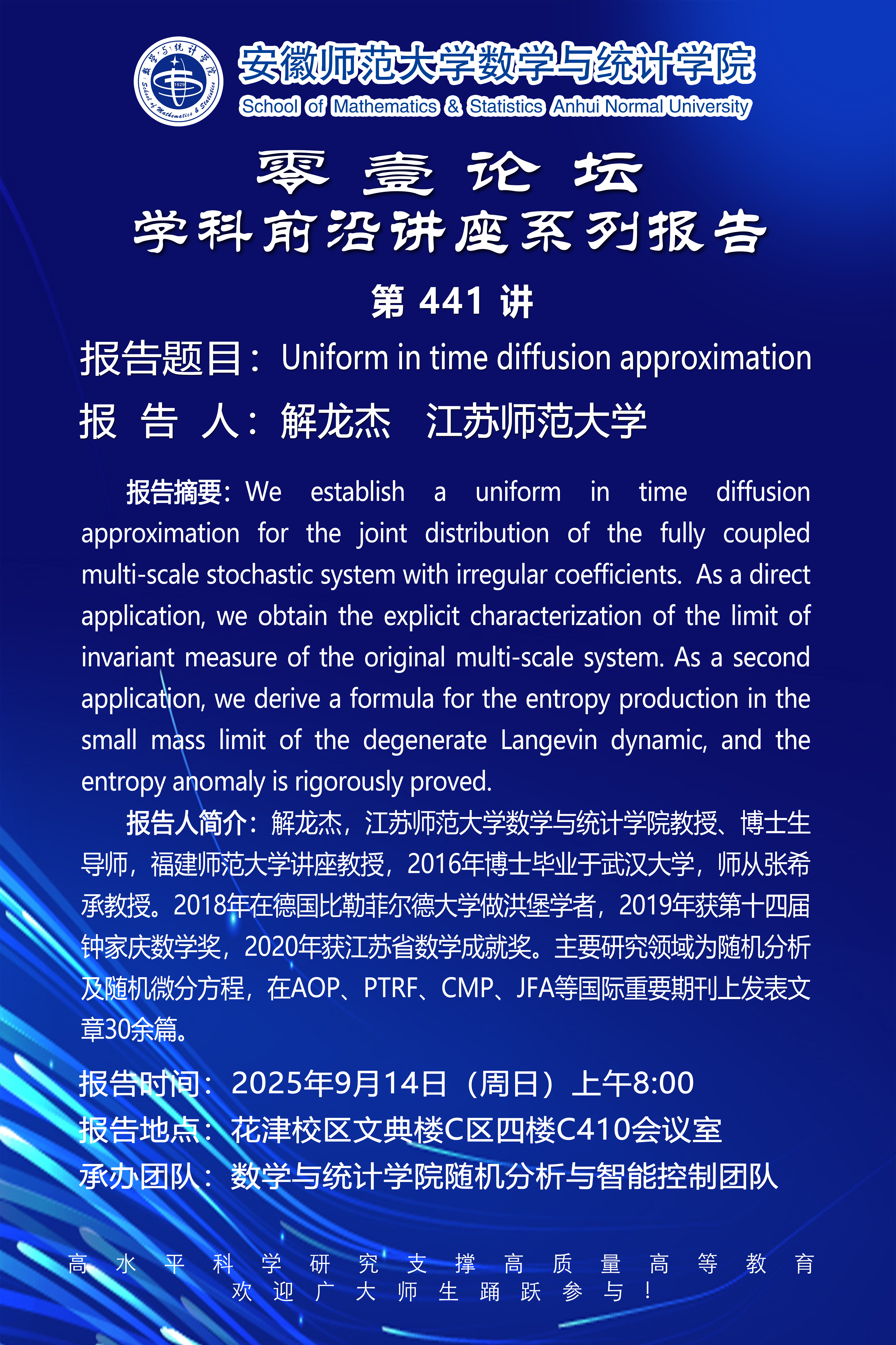 前一记录->【学术预告】随机分析与数理金融研究中心系列讲座第103讲:Diffusion approximation for slow-fast SDEs with state-dependent switching