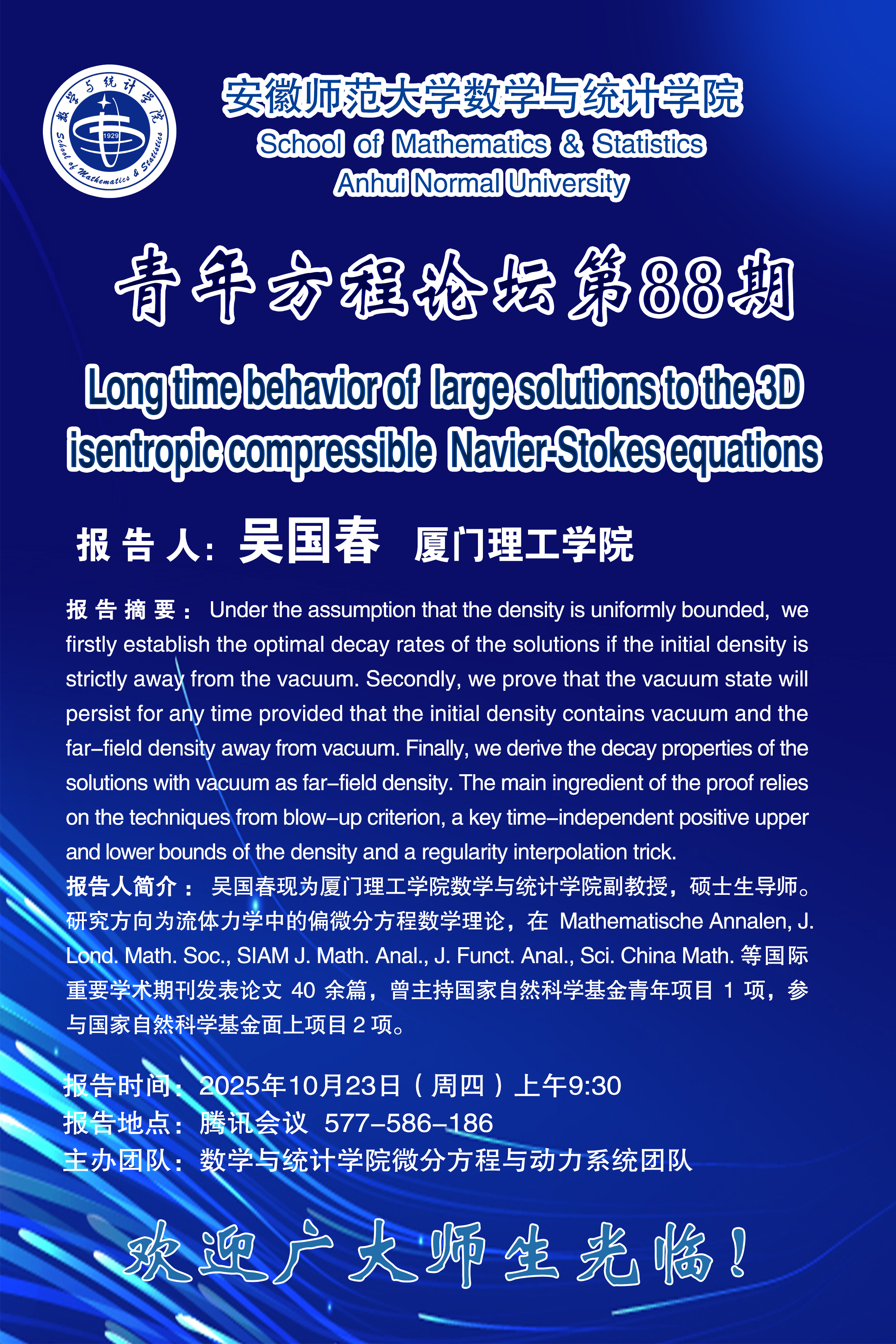 【学术预告】数统学院青年方程论坛第88期:Long time behavior of large solutions to the 3D isentropic compressible Navier-Stokes equations
