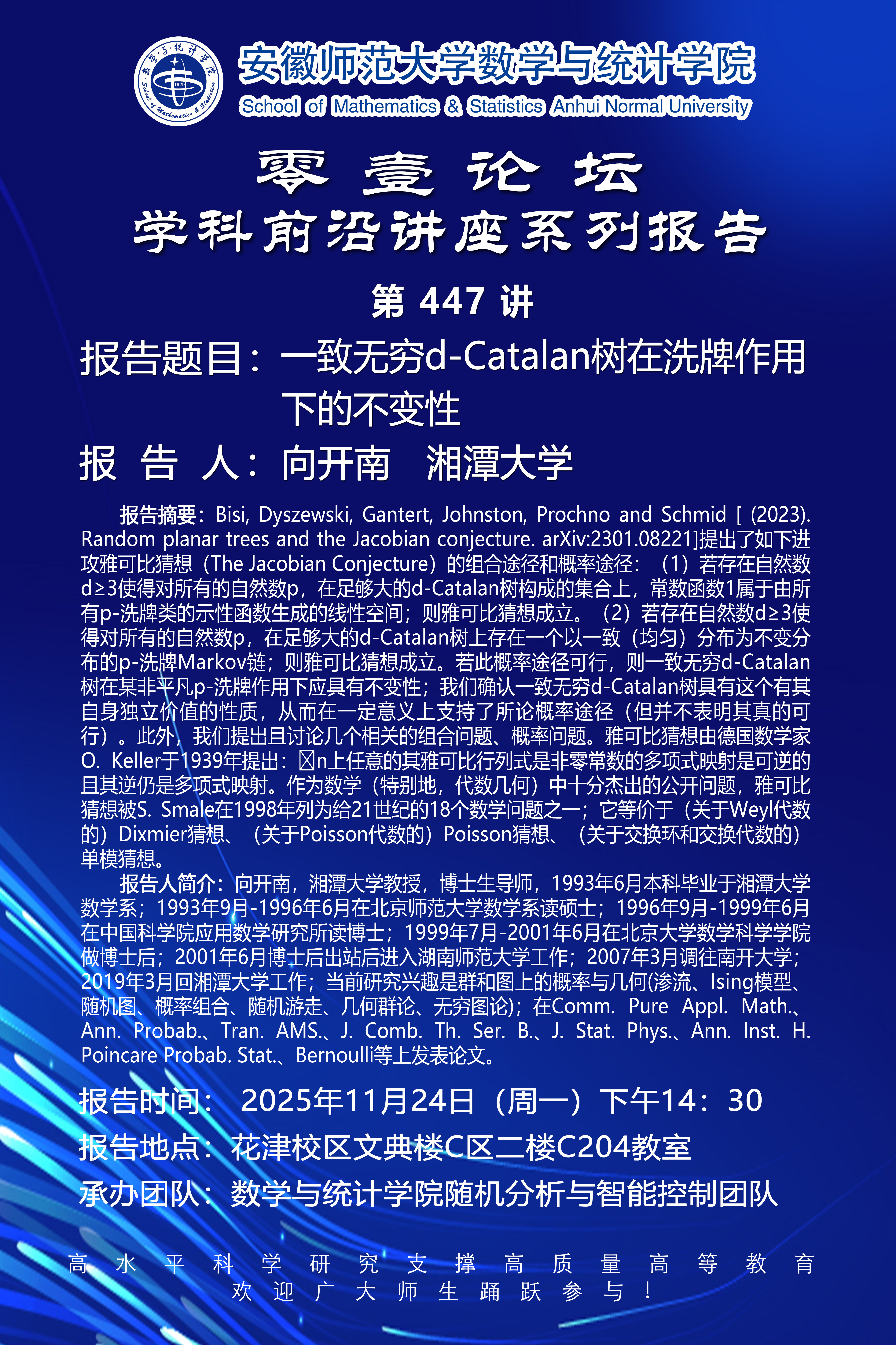 【学术预告】零壹论坛第447讲:一致无穷d-Catalan树在洗牌作用下的不变性