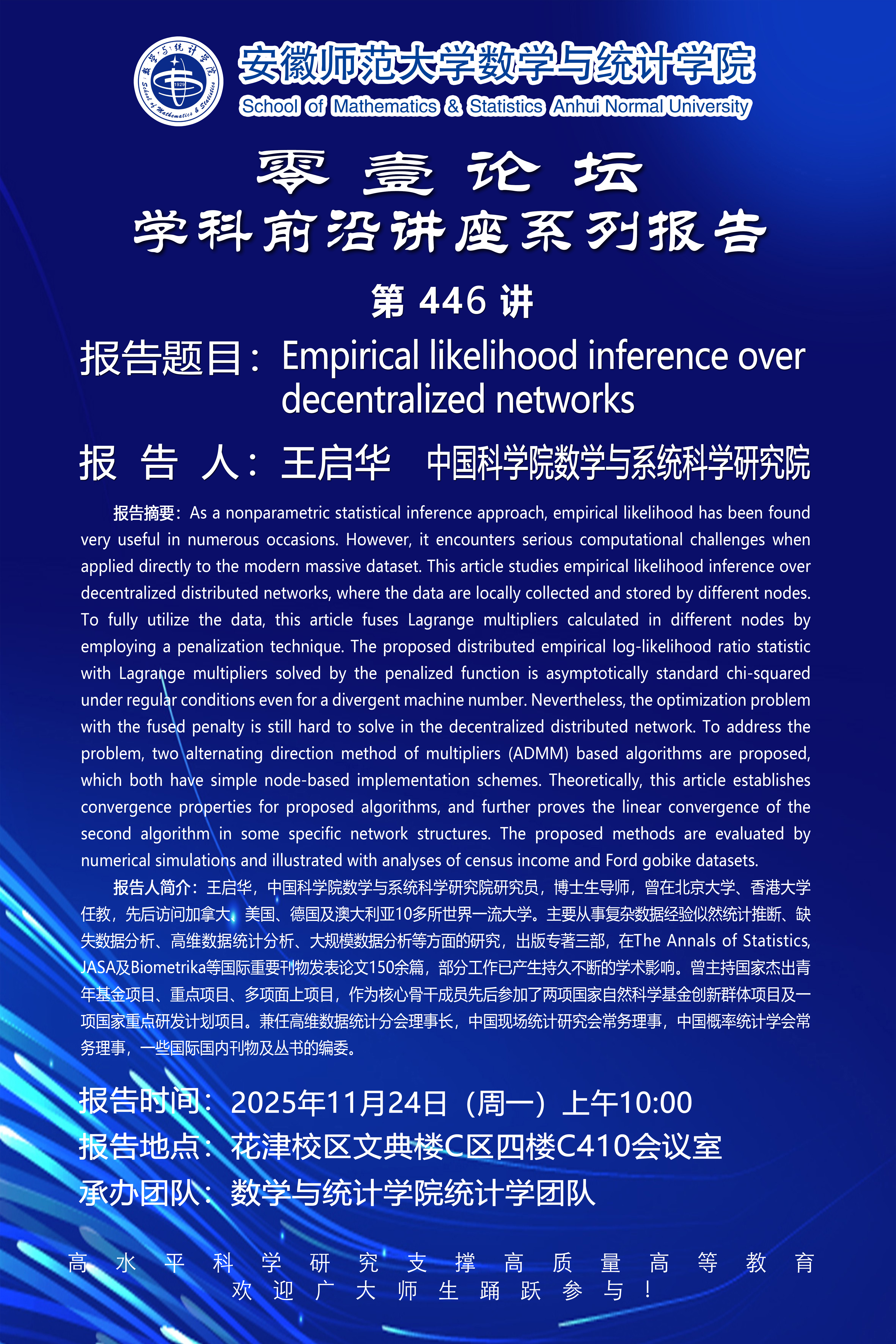 【学术预告】零壹论坛第446讲:Empirical likelihood inference over decentralized networks