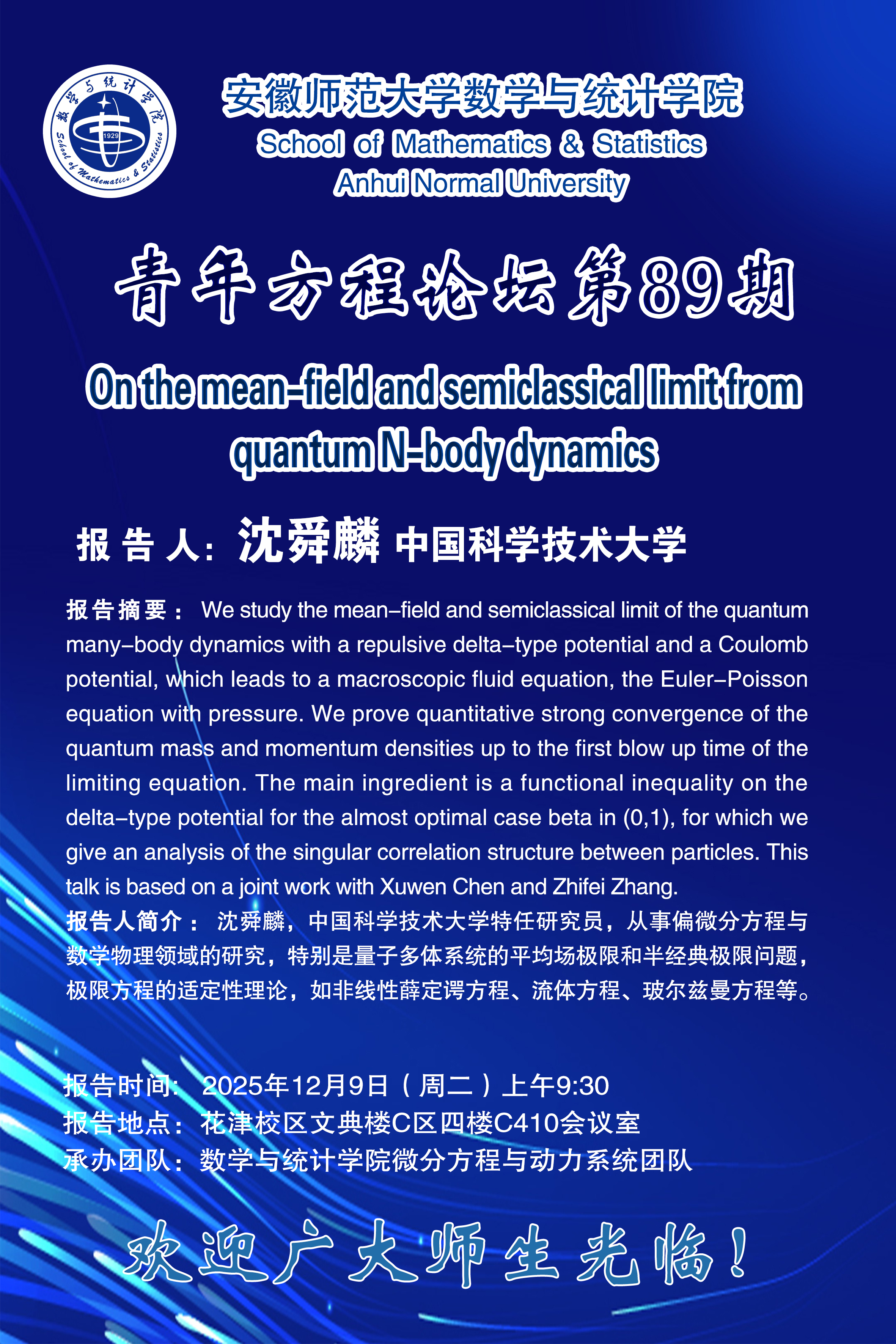 【学术预告】青年方程论坛第89期:On the mean-field and semiclassical limit from quantum N-body dynamics