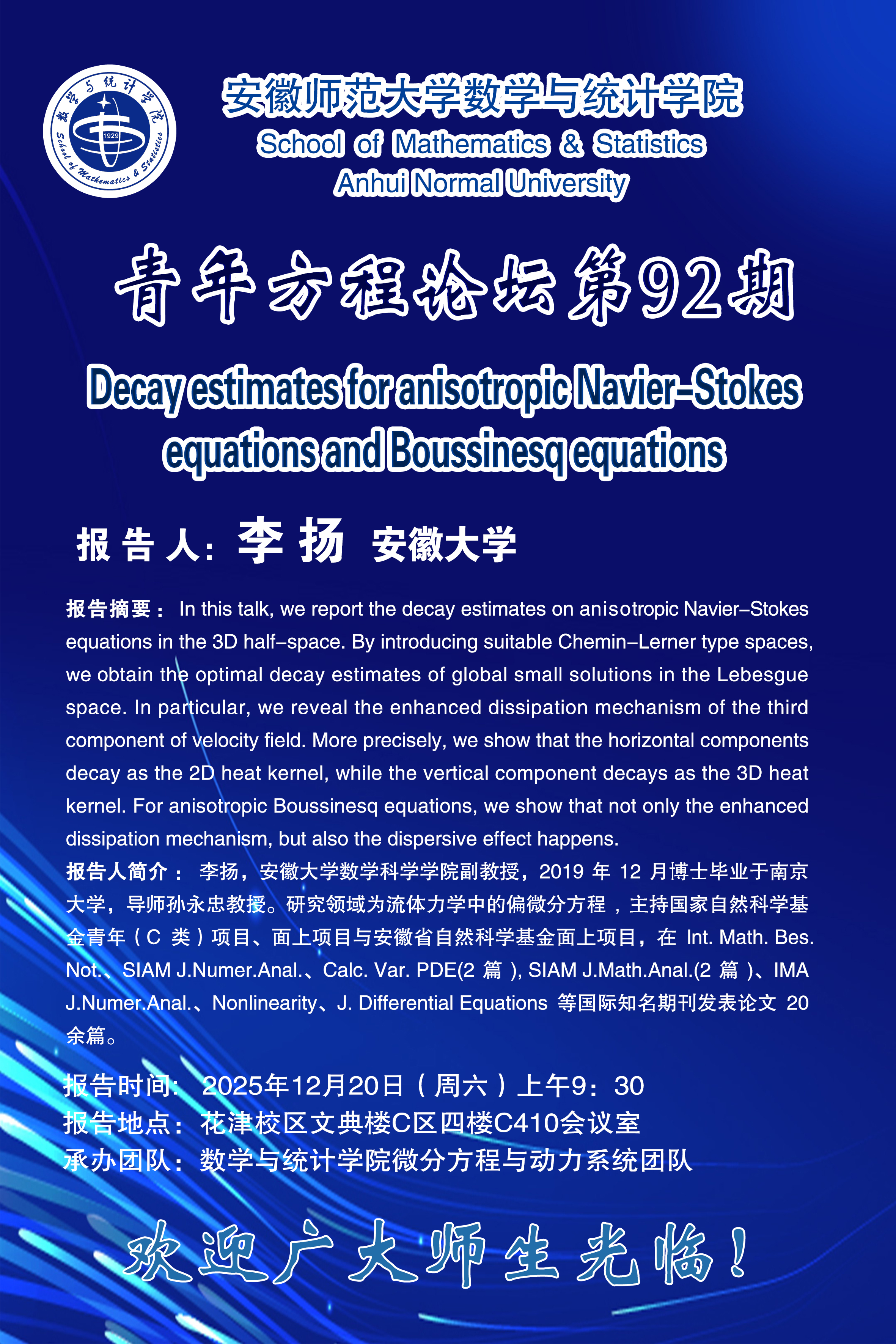 【学术预告】青年方程论坛第92期:Decay estimates for anisotropic Navier-Stokes equations and Boussinesq equations
