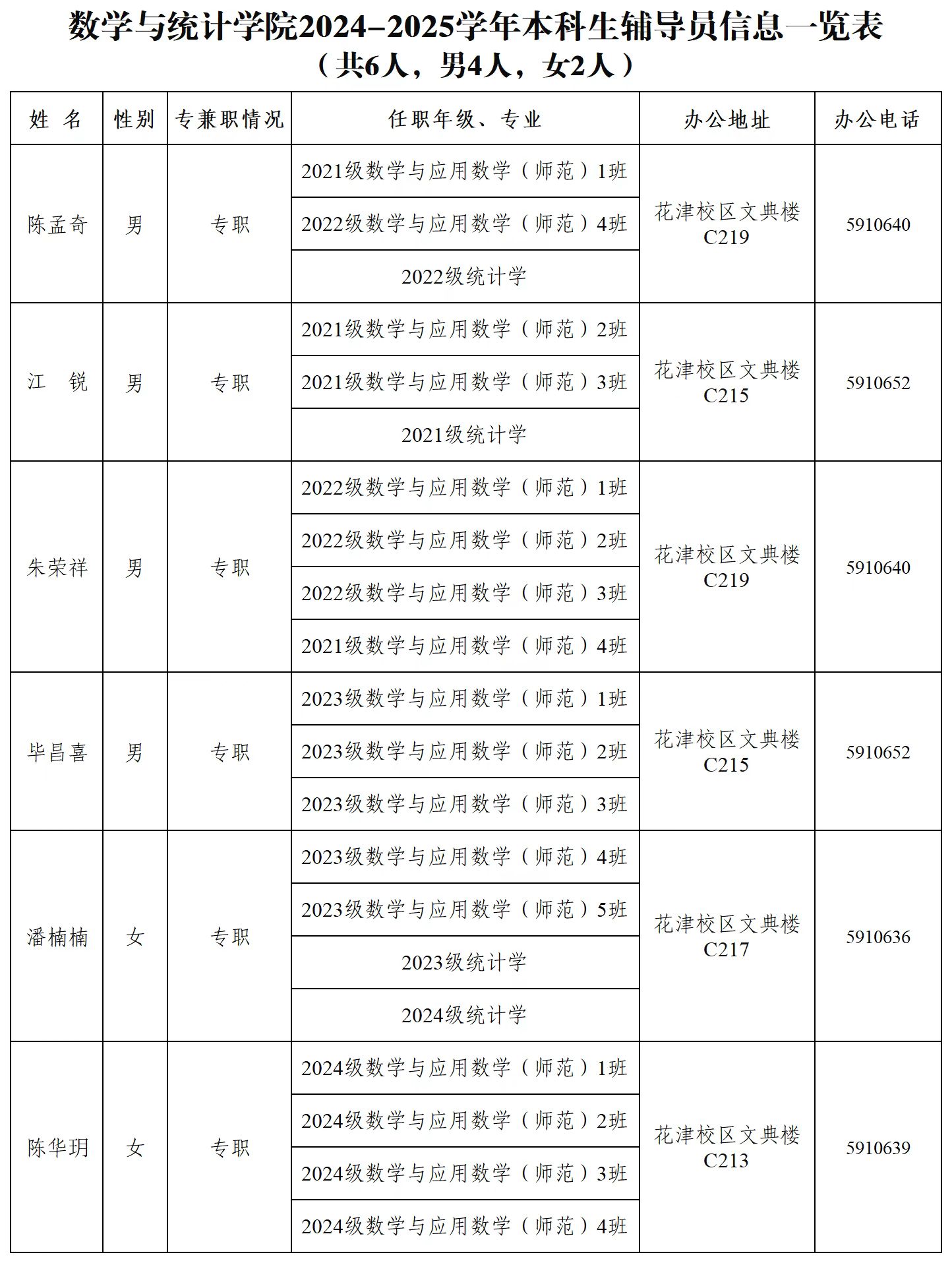 数学与统计学院2024-2025学年本科生辅导员信息一览表