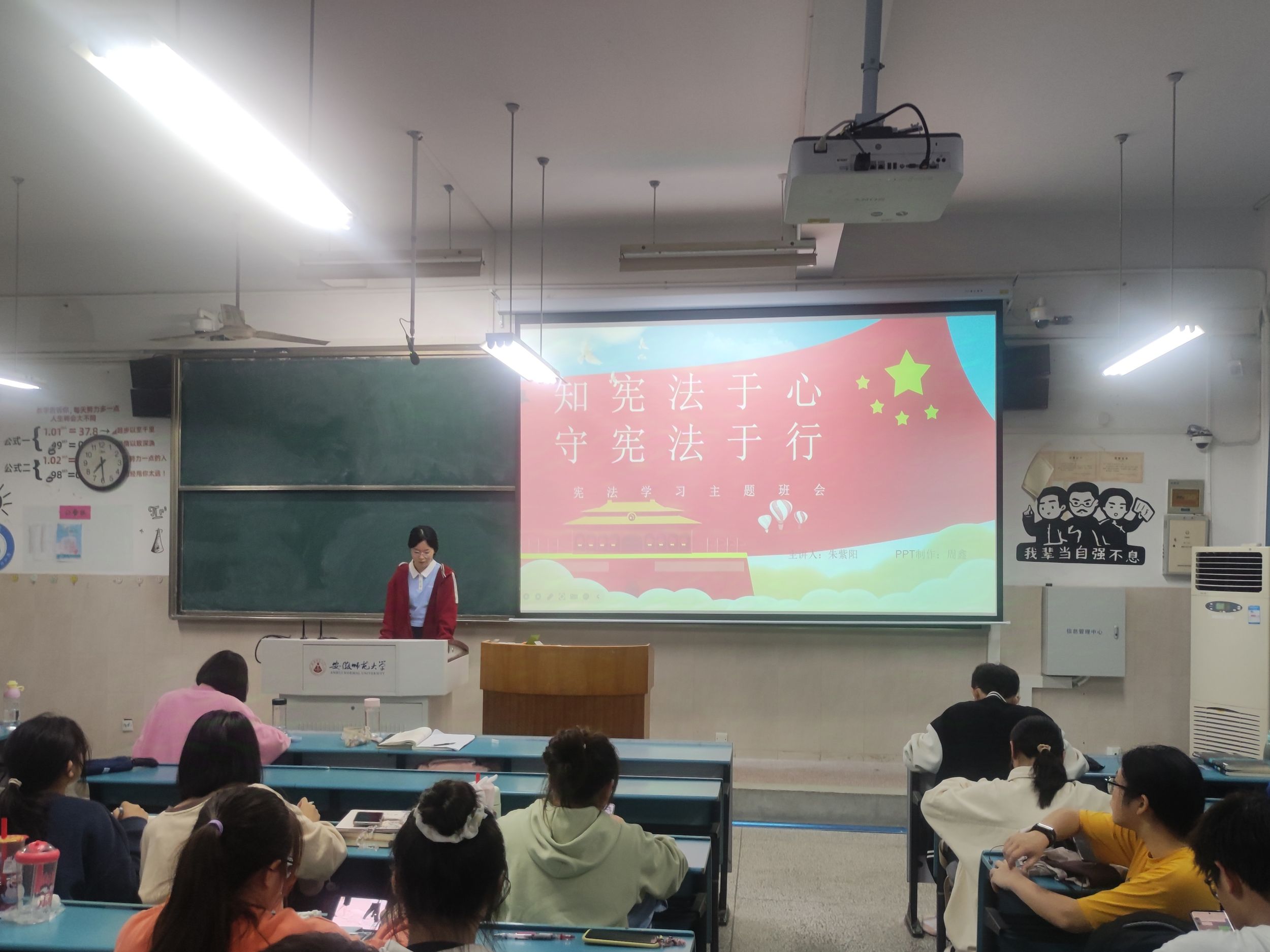知宪法于心,守宪法于行。为进一步加强对宪法的学习,普及宪法知识,弘扬宪法精神,2023级数学与应用数学(师范)4、5班于10月14日在行知楼2030304教室召开宪法学习主题班会。班会由思政委员朱紫阳主持,2023级数学与应用数学(师范)4、5班全体同学参会。