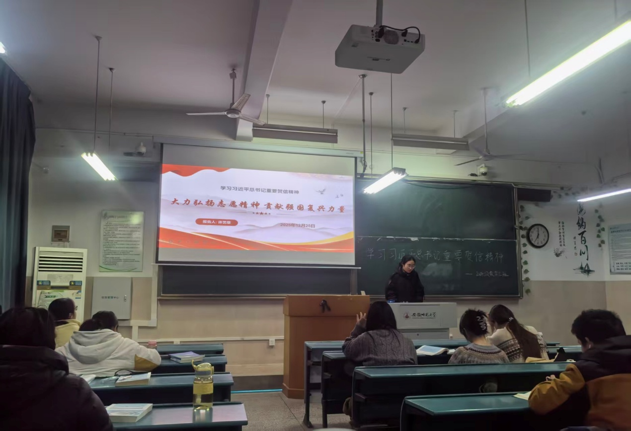 为深入学习习近平总书记重要贺信精神,引导同学们厚植志愿情怀、践行责任担当,2025年12月25日,2024级数学与应用数学(师范)3班、7班于2020304教室开展“大力弘扬志愿精神,贡献强国复兴力量”主题团日活动。本次活动由团支书许艺菲主持。