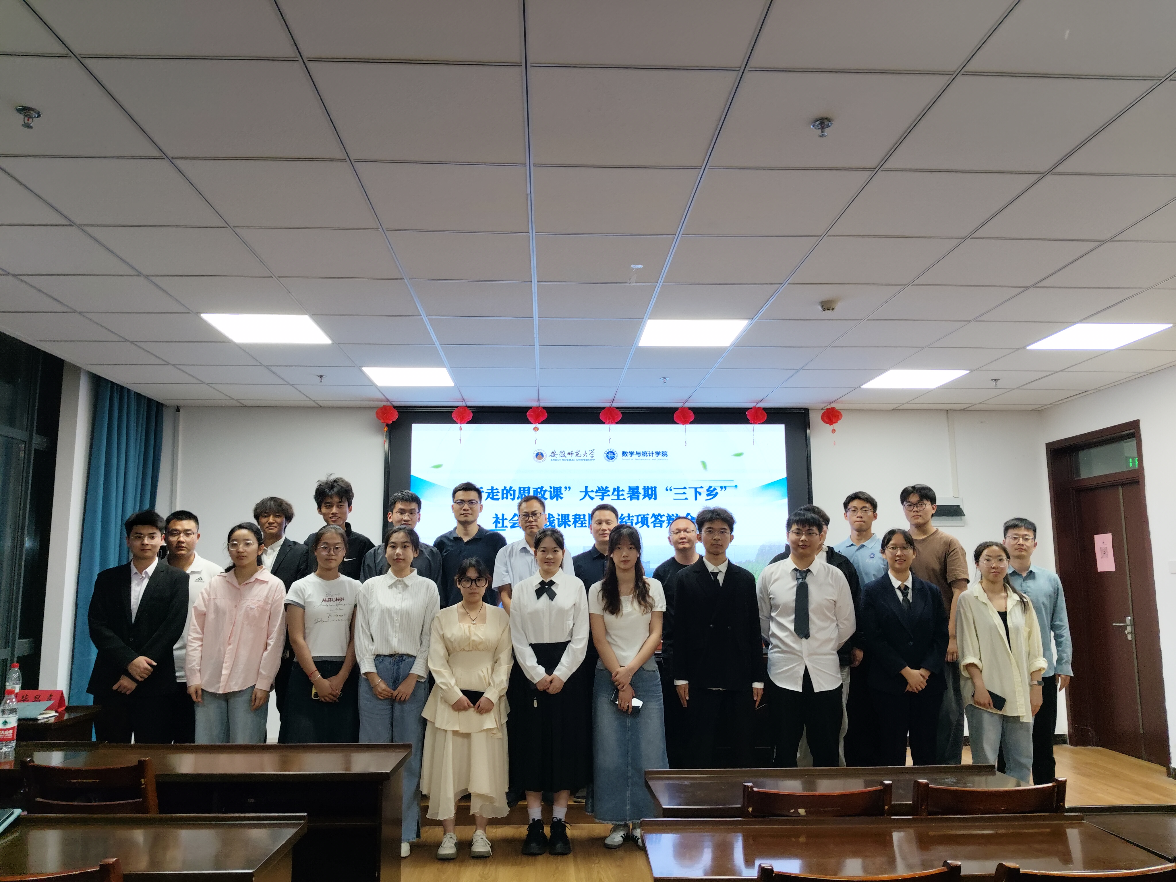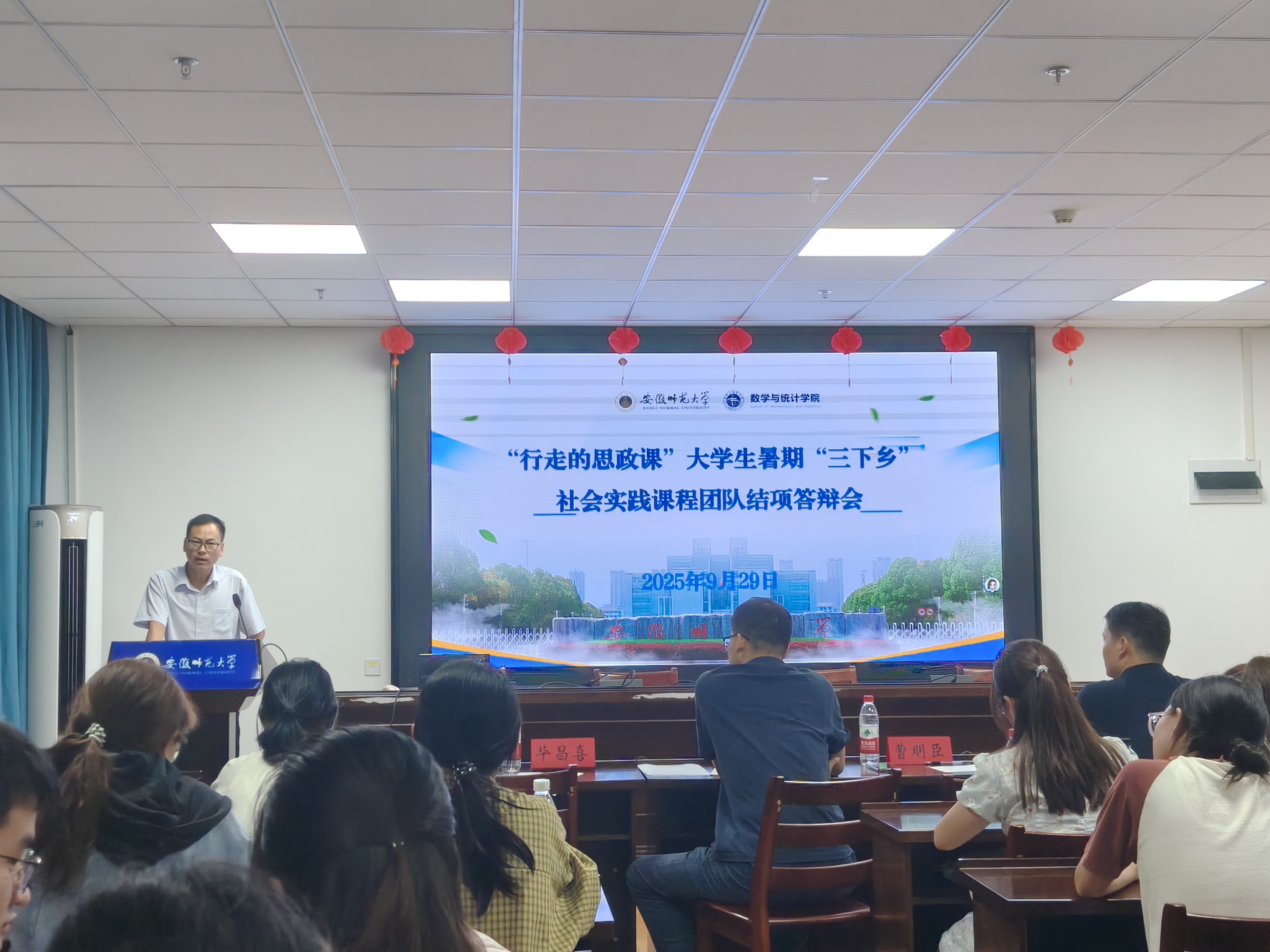 为全面总结与展示暑期社会实践成果,9月29日下午,数学与统计学院在文典楼C108报告厅举办2025年“行走的思政课”暑期社会实践课程团队结项答辩会。学院党委副书记芮先红、统计系副主任王佩君、院团委书记江锐、院团委副书记潘楠楠,辅导员毕昌喜、陈孟奇、朱荣祥,各实践团队代表、2025级新生代表共同参加答辩汇报会,思政指导教师曹明臣受邀出席活动并担任评委。