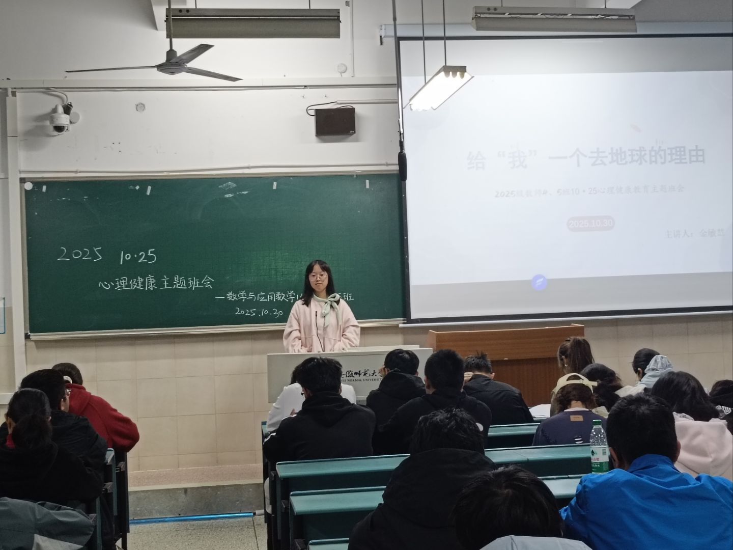 为了探究生命的意义,引导同学们聚焦当下生活,理解自我生命价值,2025年10月30日晚上,2025级数学与应用数学(师范)专业4、5班在花津校区行知楼2050401教室开展心理健康日活动——“给‘我’一个去地球的理由”,四班心理委员金敏慧同学主讲,4,5班全体同学积极参与,并取得较好成效。