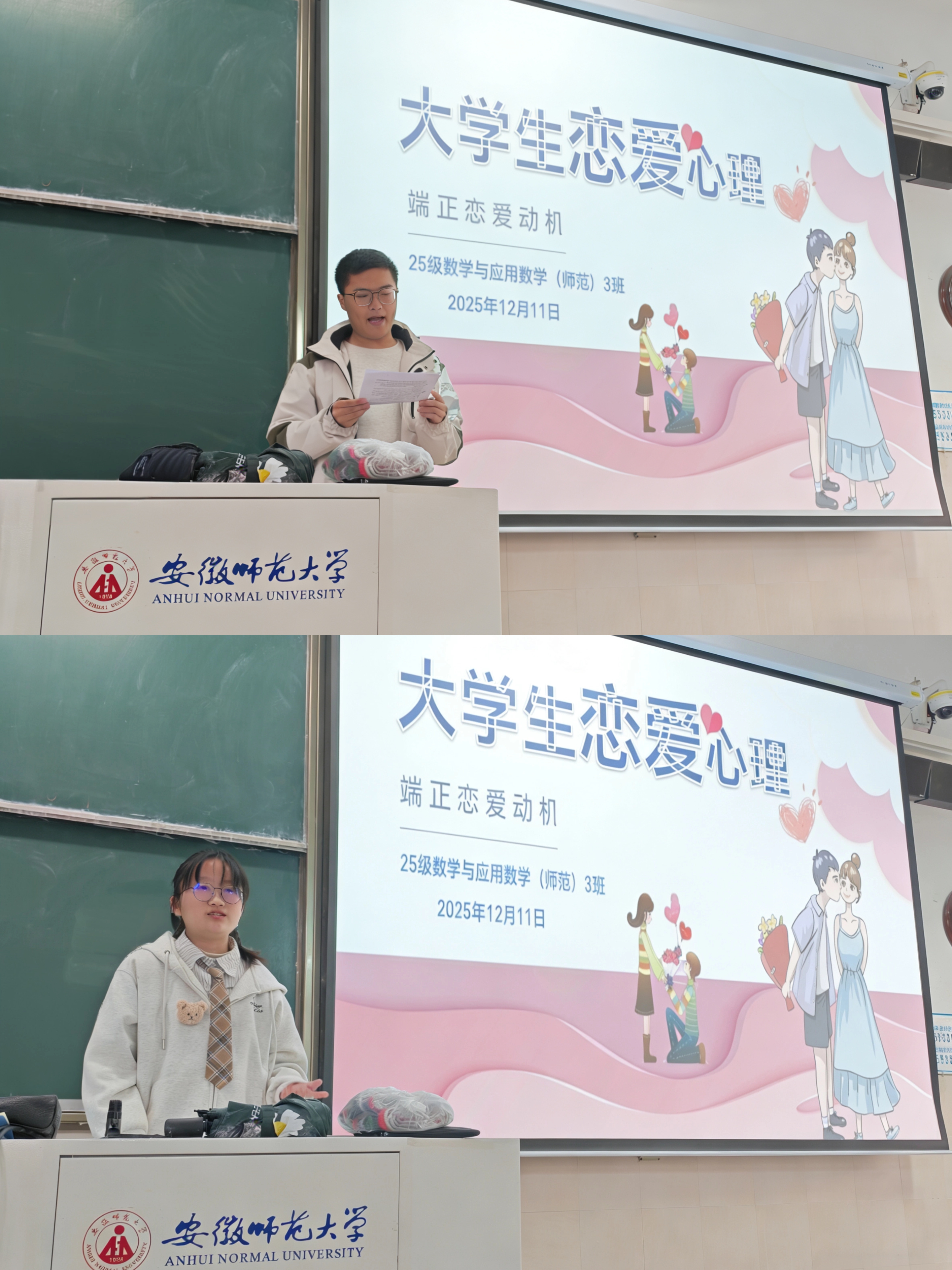 为全面落实立德树人根本任务,强化思想引领、深化学风建设、促进学生心理健康,数学与应用数学(师范)专业2025级3班于第十五周集中组织开展“护航成长·赋能发展”系列主题活动。活动围绕诚信应考、情感关怀、反诈安全与思政育人等多维度展开,旨在全方位助力学生健康成长与全面发展。