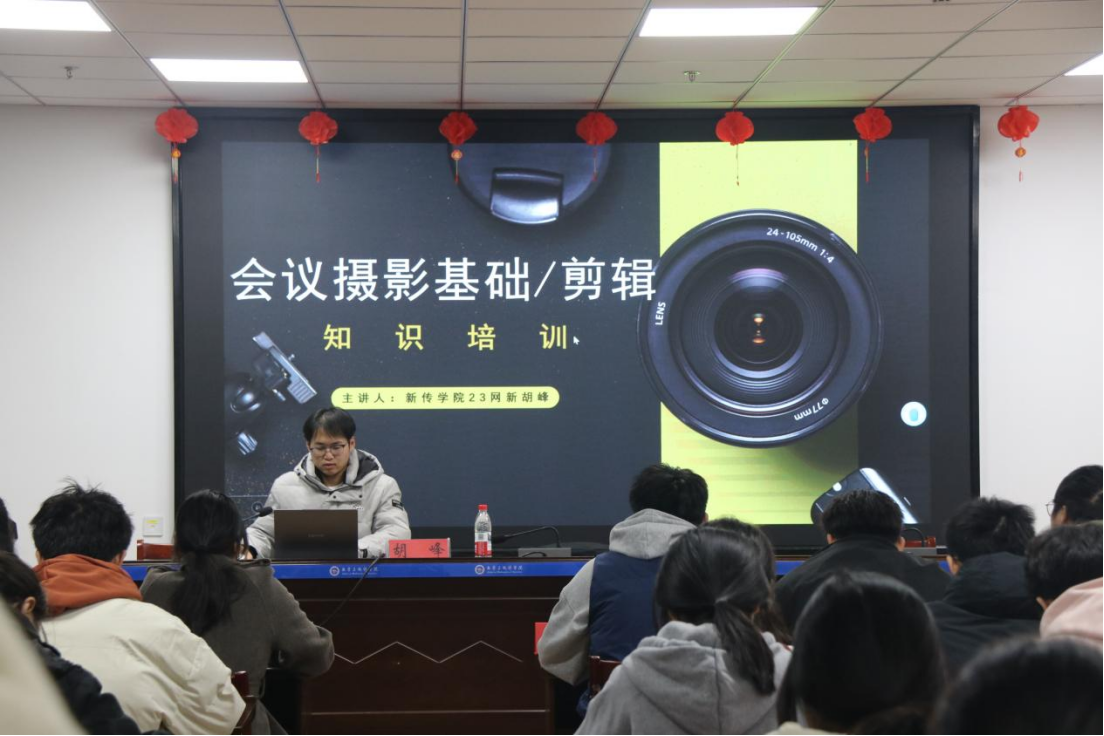 新传学院2023级网络与新媒体专业胡峰同学主讲会议摄影与剪辑知识培训,内容涵盖会前筹备、设备调试、场景抓拍、素材整理和后期剪辑五大模块,培训重点讲解了流程梳理、参数校准、构图技巧及剪辑节奏等实操要点。鼓励大家灵活运用所学技巧,提升会议宣传素材质量,精准传递会议核心信息。