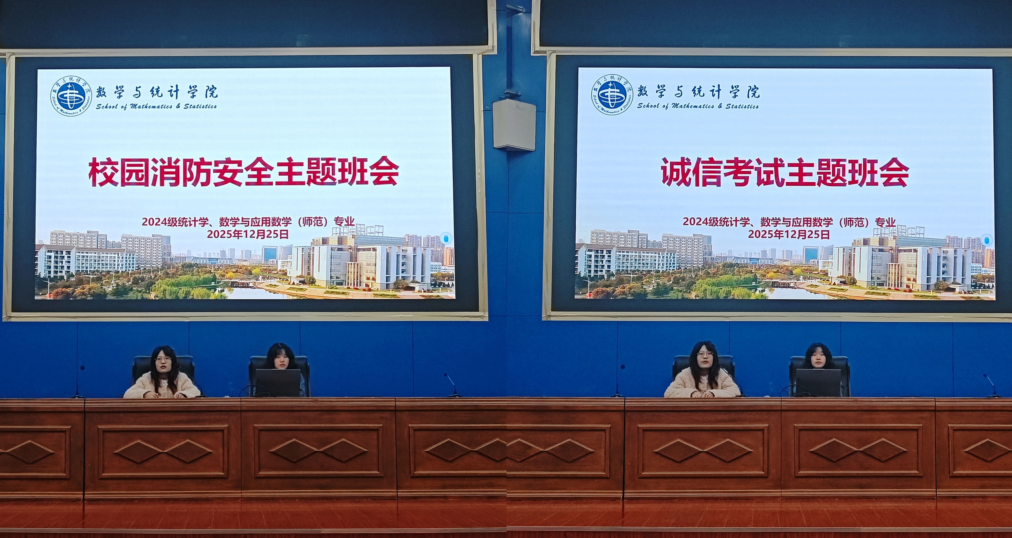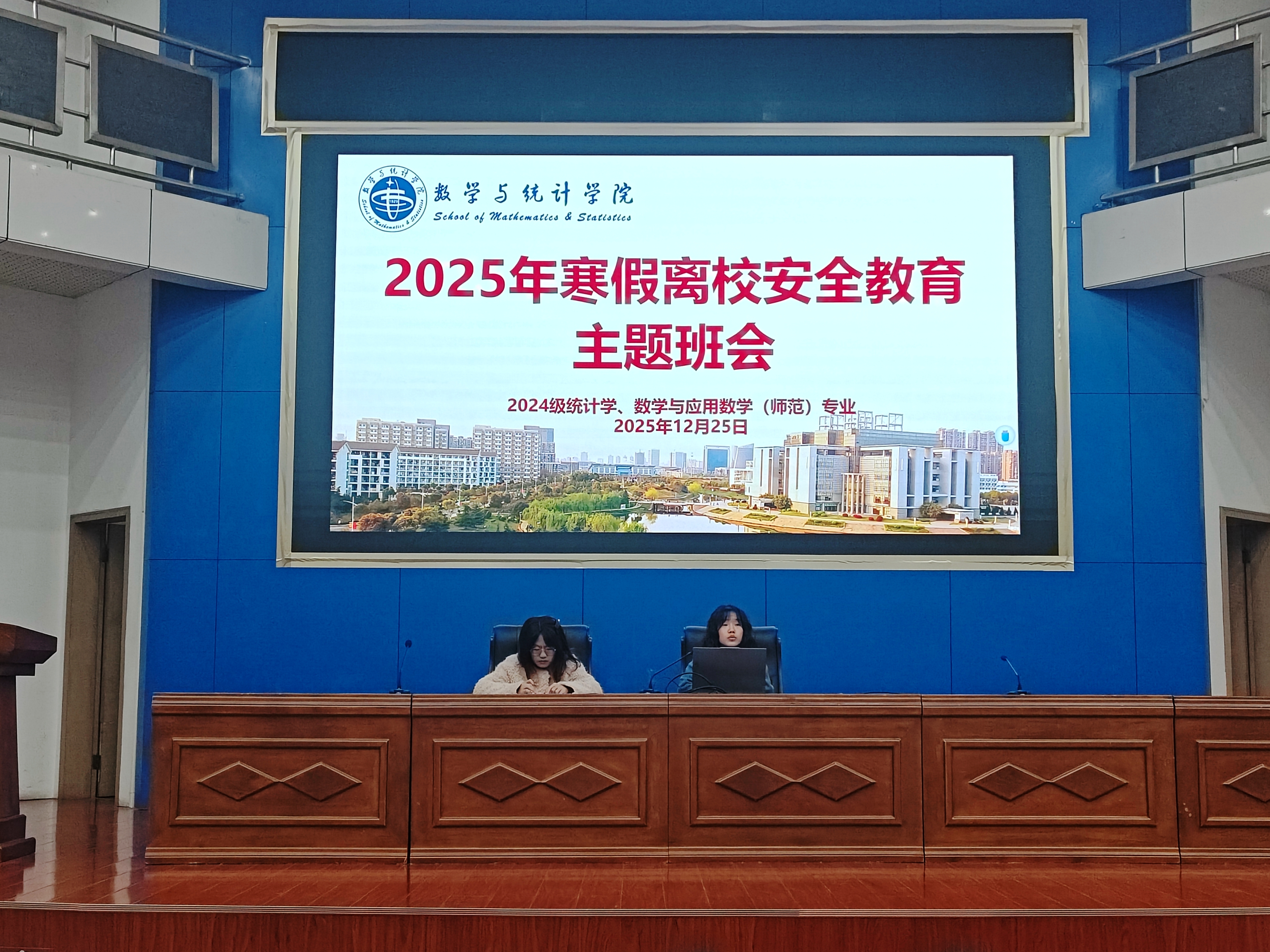 为扎实做好寒假离校前各项安全保障工作,进一步强化学生安全意识,引导学生度过一个平安、充实、有意义的假期,数学与统计学院于2025年12月25日下午召开2025年寒假离校安全教育主题班会。辅导员潘楠楠、陈华玥主持会议,学院2024级全体本科生参会。