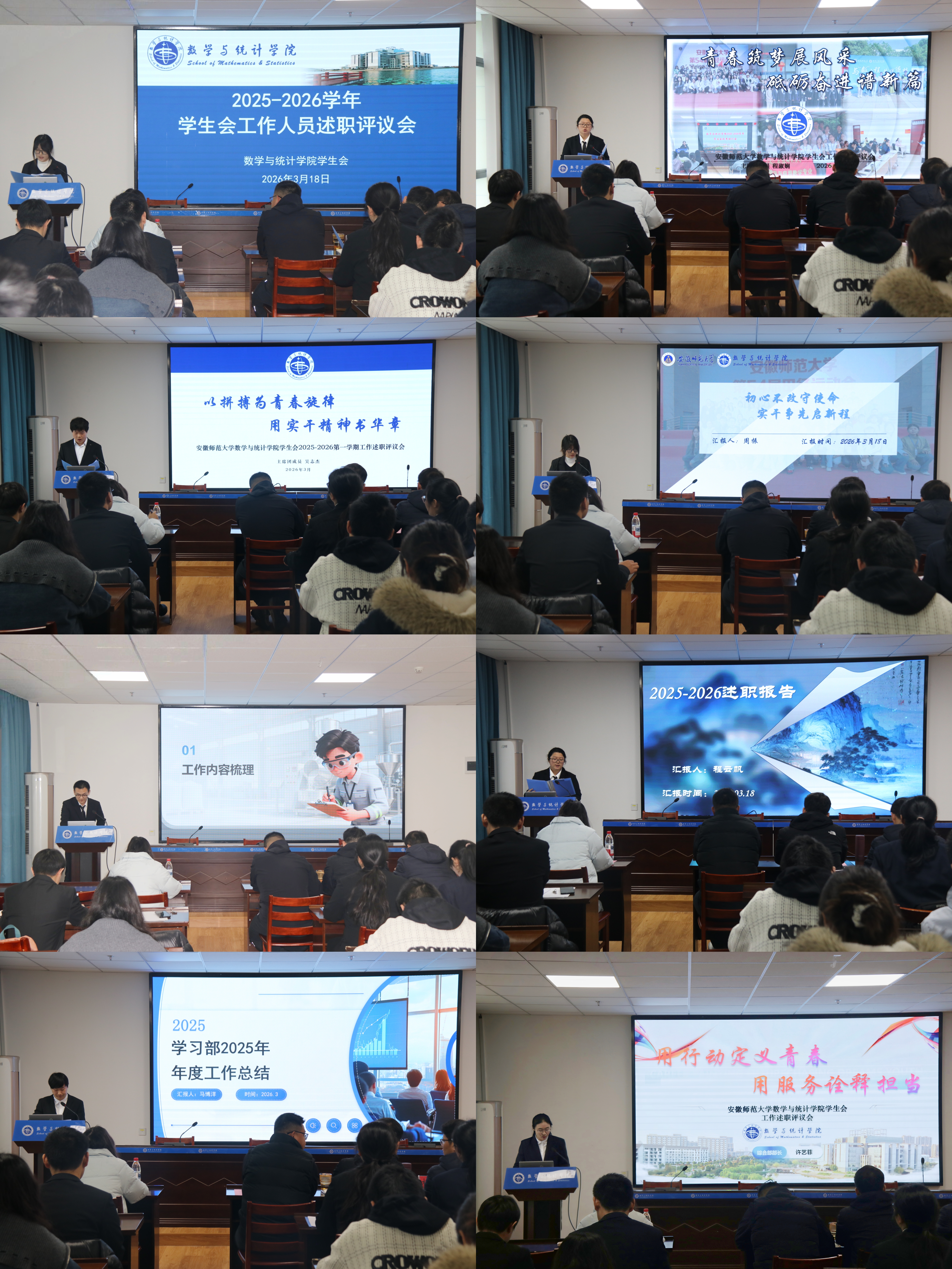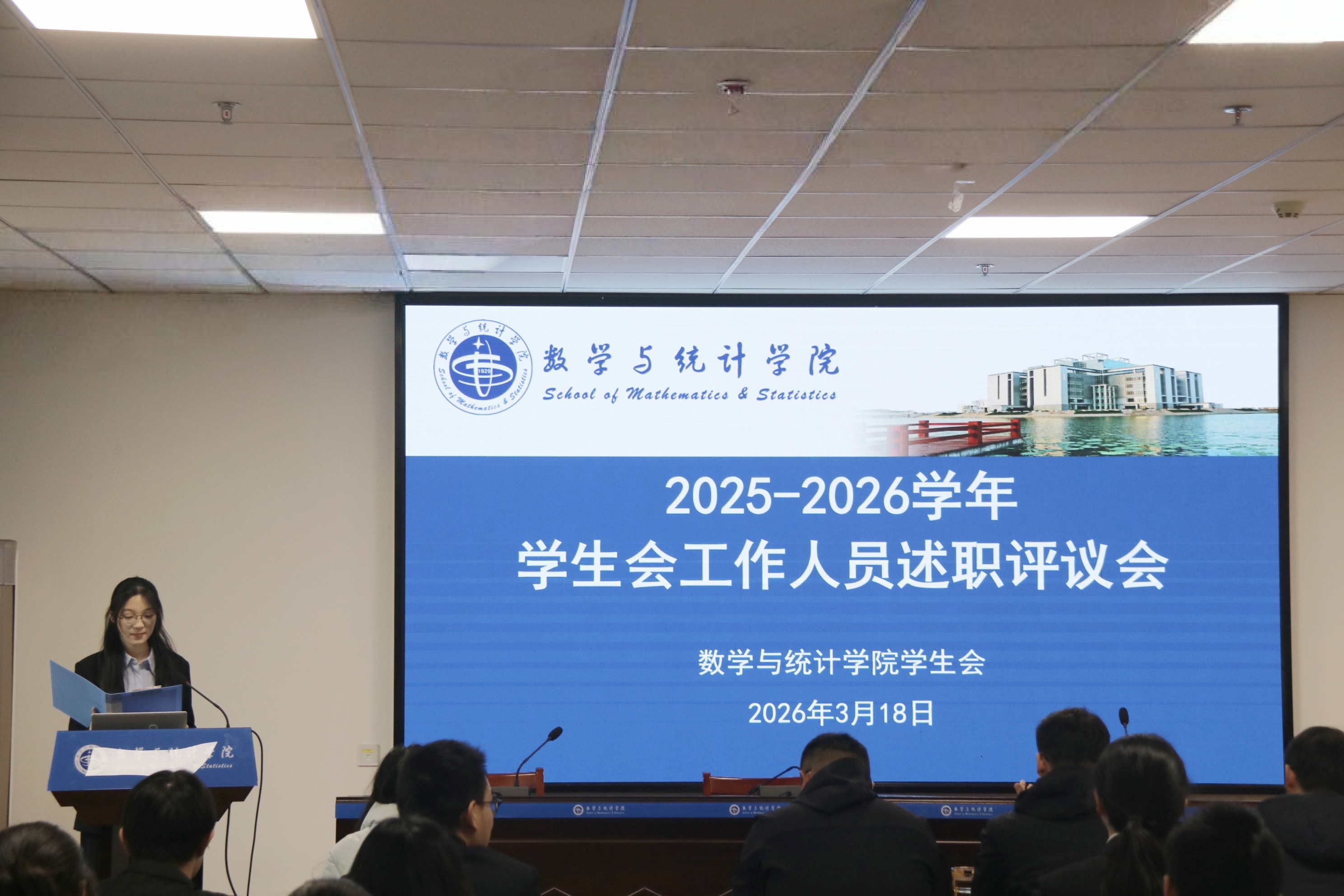 为全面总结2025-2026学年第一学期学生会工作成效、规划本学期工作重点,切实提升工作质量与效率,数学与统计学院学生会于2026年3月18日下午在文典楼C108报告厅召开2025-2026学年第一学期述职评议大会。学院党委副书记杨礼玉、团委书记江锐、团委副书记潘楠楠、研究生指导老师朱荣祥、辅导员陈华玥,以及校学生会代表、学院学生会工作人员、2024级与2025级各班班长及学生代表参加会议。大会由学院学生会综合部部员陈婉桐主持。
