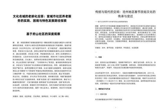 “社会观察课”调研同样紧扣时代脉搏、直面现实问题。王晗宇走进县域街头巷尾,探寻小县城的新时代脉动,记录县域产业升级与民生改善的鲜活实践;陈梦琪聚焦县域青年生活方式,以《消费觉醒与社交荒漠》为题,深入调研县域经济下小镇青年的消费观念与社交状态,揭示新时代青年的生活图景与发展诉求;吴博文立足宣城市养老现状,完成《文化名城老龄化应答》调研,探索社区养老服务的实践困境与特色发展路径,为城市老龄化治理贡献青年智慧;张佳欣则走进沧州,以《传统与现代的交响》为题,梳理当地春节民俗文化的传承与变迁,让传统非遗在时代浪潮中焕发新生。