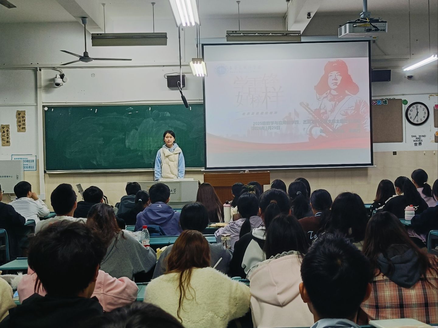为了引导同学们传承雷锋精神、强化使命担当,2026年3月29日晚,2025级数学与应用数学(师范)专业4、5班在花津校区行知楼2050401教室召开学习雷锋精神主题团日活动,5班团支书宋博雅主讲,4、5班全体同学参加。