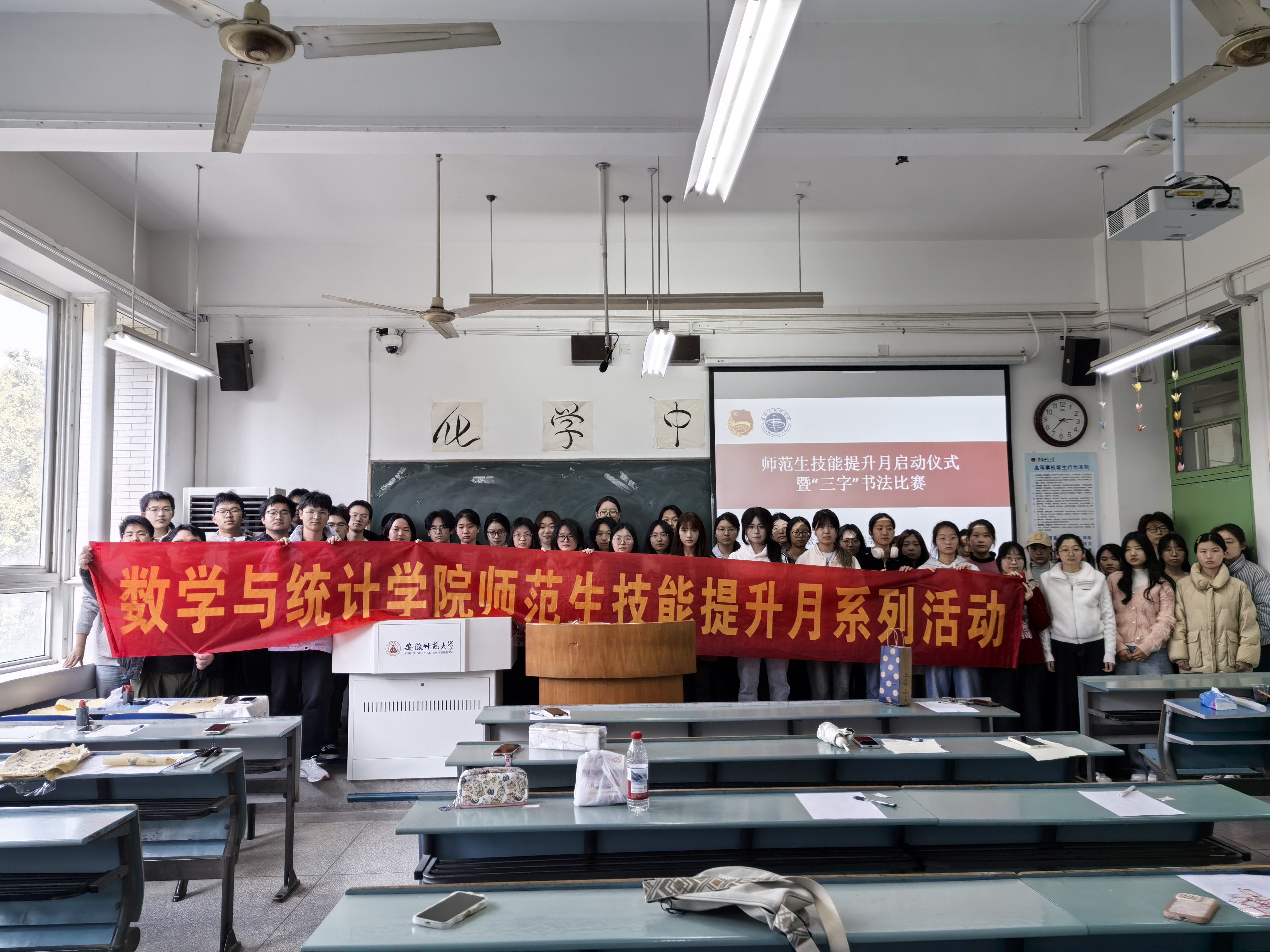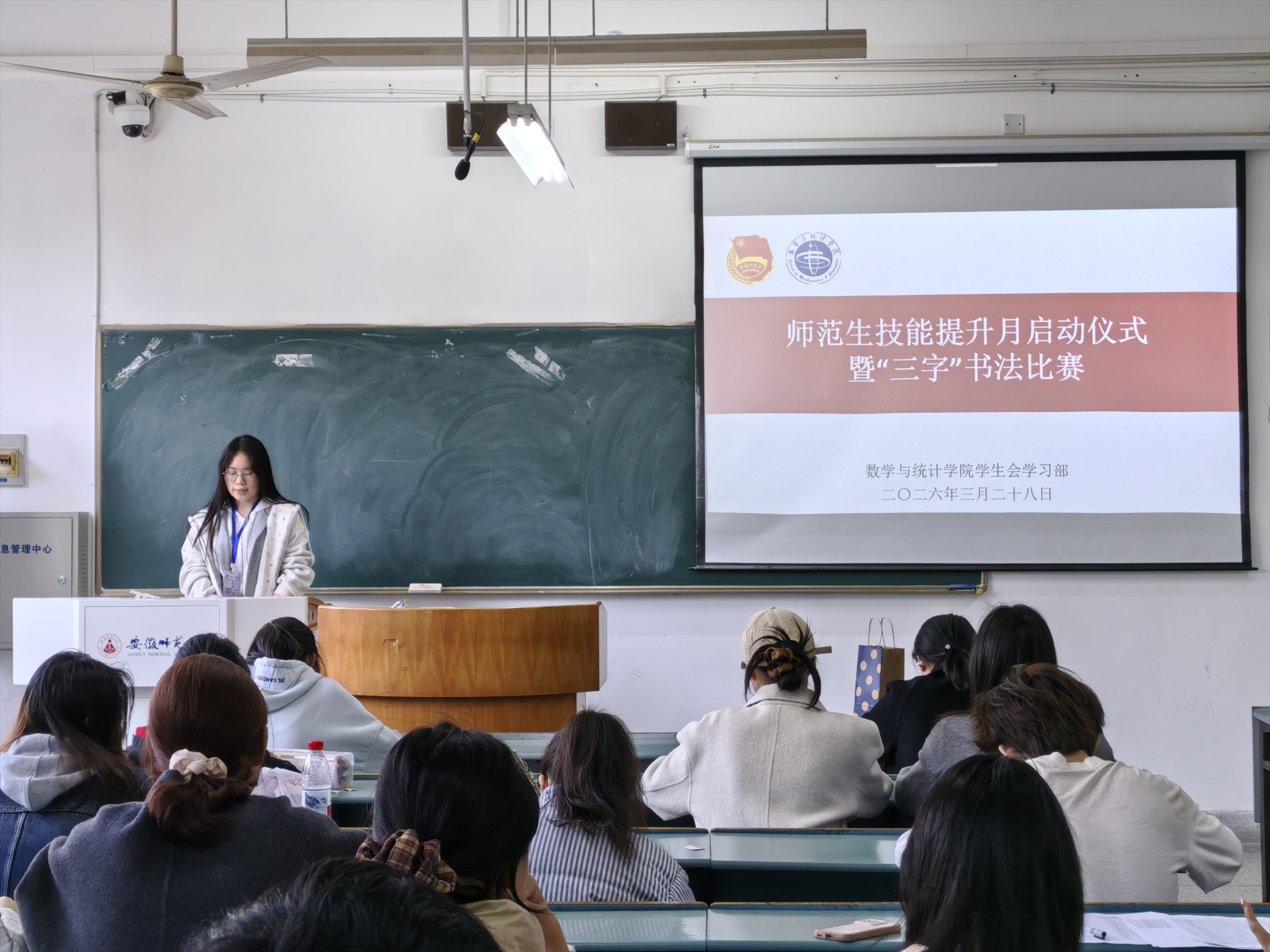 安徽师范大学数学与统计学院师范生技能提升月启动仪式暨“三字”书法比赛在2026年3月28日下午于行知楼2070207举行。数统学子以笔为媒,在横竖撇捺间书写师者初心,在墨韵流转中传承文化基因。