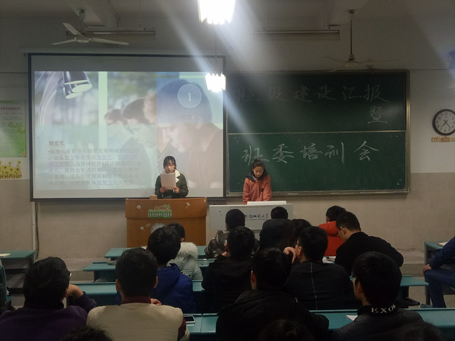会议伊始,王程老师向各位班委成员介绍了这次活动的大致内容以及目的。紧接着,三个班的班长团支书互相配合依次进行了2016年的班级建设的汇报。屏幕上对去年的回顾总结,既是对去年班委工作的见证,也是新一年班委们努力服务班级的动力。汇报在所有的班委成员的掌声中结束,辅导员王程老师对汇报点评分析,给了在座的班委许多建议,叙述中有对日后班委们工作进步的期待。同时,王程老师提出“如何做一个合格的班干”中,简练有力的告诉班委同学们做好班干的要点。一句“身为辅导员,我是你们最坚强的后盾”伴着大家的掌声,结束了这次会议。