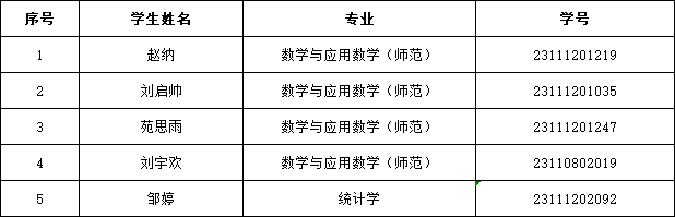 根据《财政部 教育部 人力资源社会保障部 退役军人部 中央军委国防动员部关于印发〈学生资助资金管理办法〉的通知》(财教〔2021〕310号)、《关于印发〈安徽师范大学本科生国家奖学金评选办法(2025年修订)〉〈安徽师范大学本科生国家励志奖学金评选办法(2025年修订)〉〈安徽师范大学本科生国家助学金评选办法(2025年修订)〉的通知》(校学字〔2025〕6号)和《关于认真做好我校2025年国家奖助学金评审推荐工作的通知》(校学字 (2025) 20号)文件精神,经个人申请、班级评议、学院党政联席会议研究决定,现将数学与统计学院2024-2025学年国家奖学金评审结果公示如下: