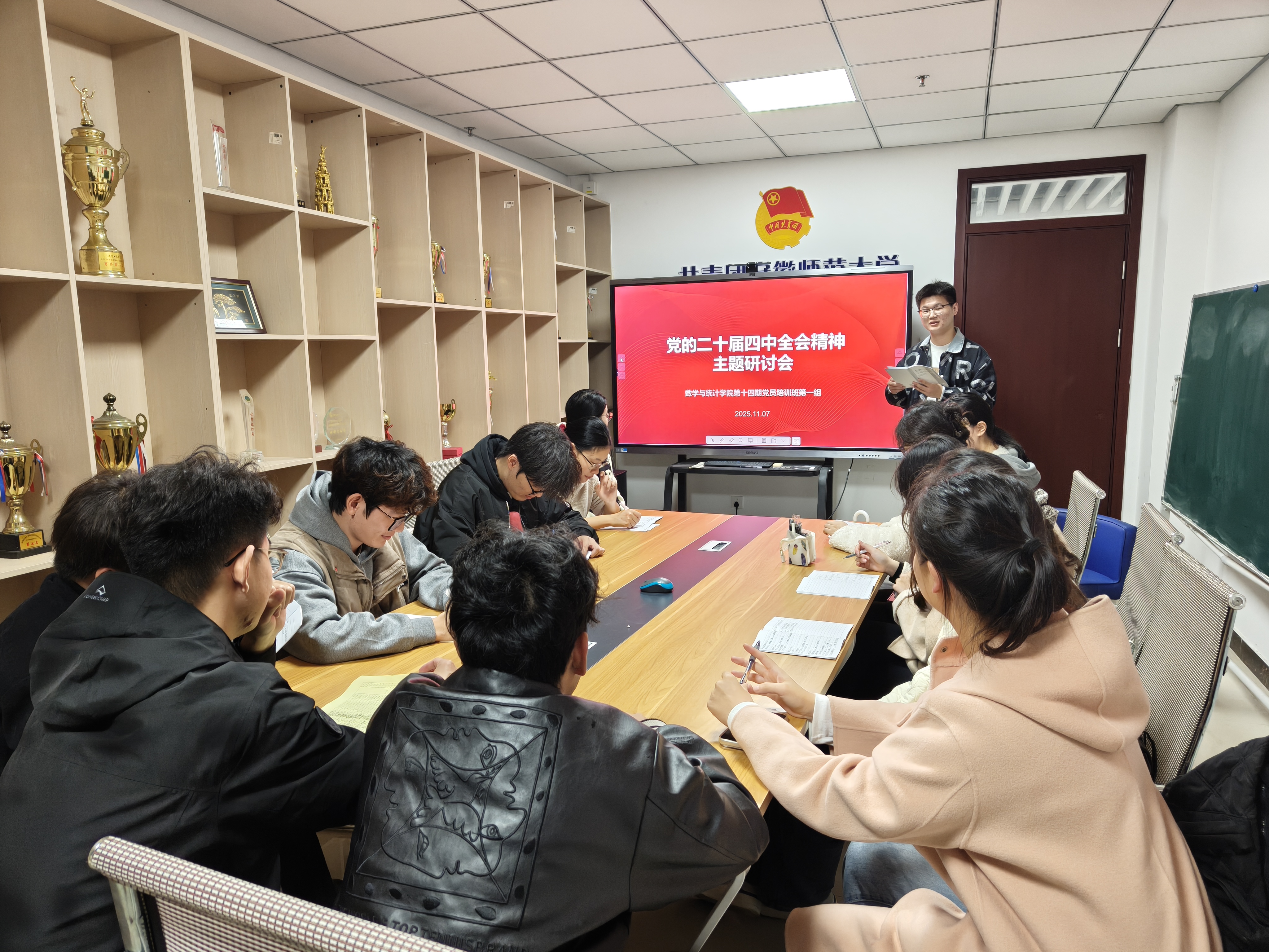 为深入学习贯彻党的二十届四中全会精神,引导学生党员自觉将个人成长融入国家教育事业发展大局,11月7日,数学与统计学院分党校第十四期党员培训班第一组全体学员在文典楼C218成功举办“学习党的二十届四中全会精神”主题研讨会。本次研讨会由学员马铭主持。