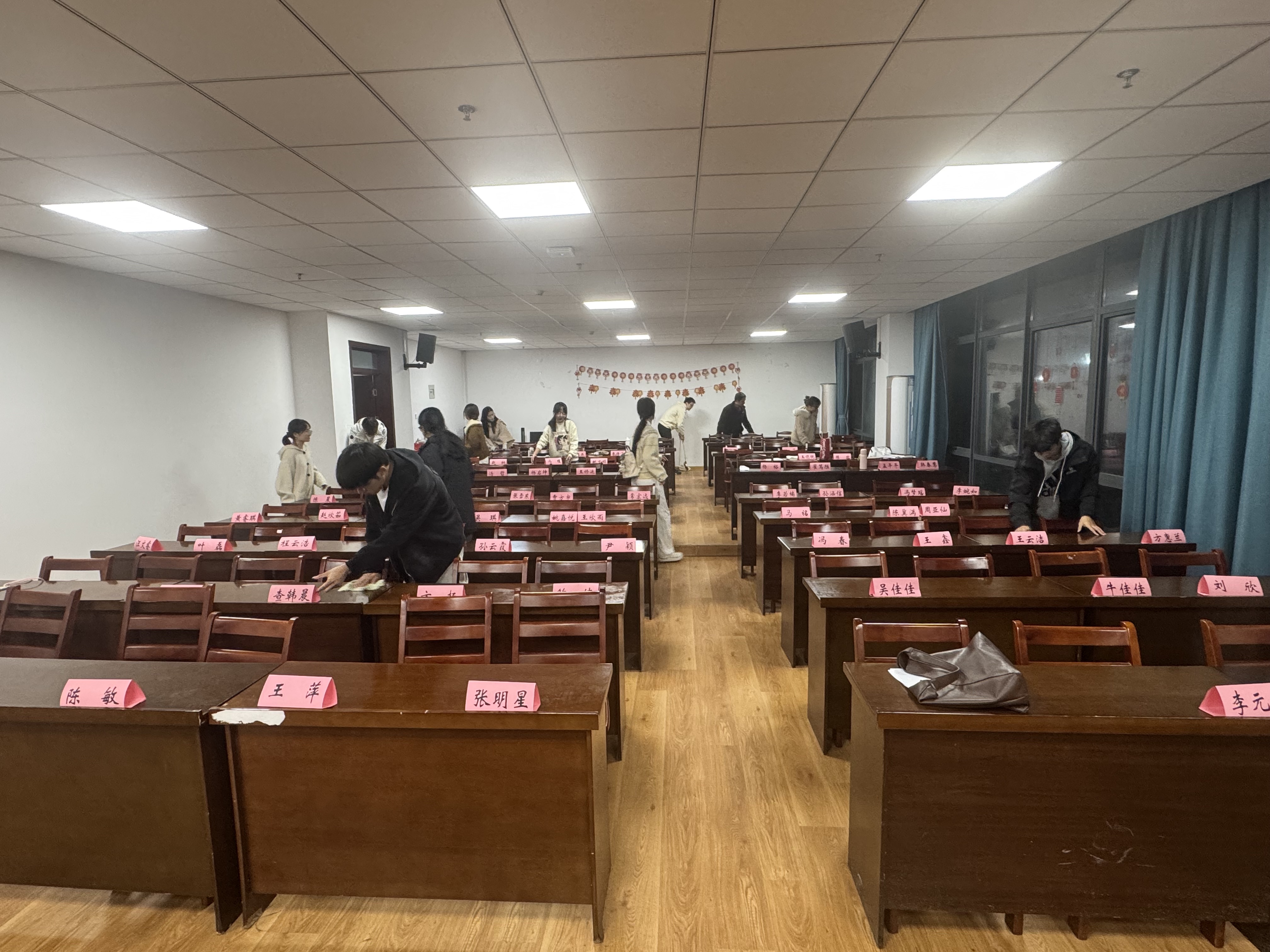 活动伊始,学员们迅速在文典楼C108报告厅集合,在组长杨裕的指导下明确分工,有序开展工作。三人负责清扫地面浮尘与纸屑,三人专注门窗、黑板、桌椅的清洁,一人负责锁门和关灯。在C108报告厅的清扫过程中,学员们热情高涨,充分发挥团结协作精神。齐心协力、各司其职的同时做到互帮互助,有的弯腰捡拾桌下杂物,有的踮脚擦拭窗户玻璃,不放过墙角、桌缝、窗台等卫生死角。经过学员们的共同努力,教室焕然一新,地面一尘不染,桌椅摆放整齐,门窗玻璃洁净透亮,卫生工具分类归置,此次活动不仅改善了教室卫生环境,更让学员在劳动中体会到用实际行动诠释责任与担当的意义,为校园建设贡献力量。